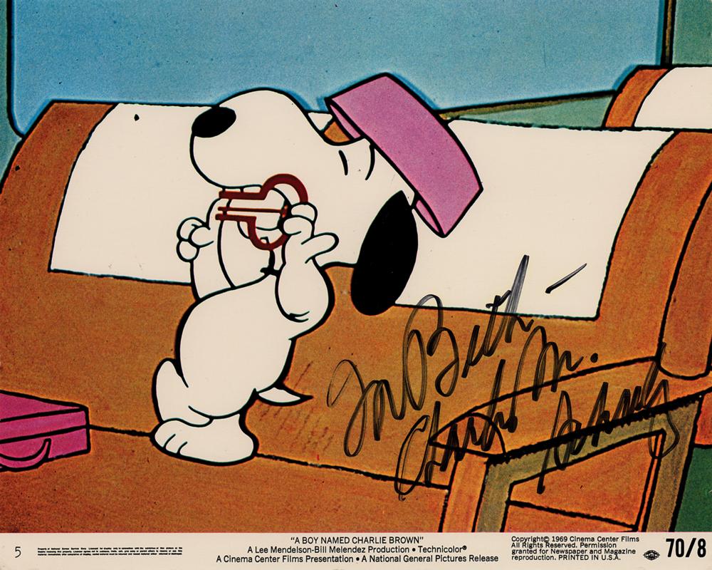 Color semi-glossy 10 x 8 cardstock National General Pictures publicity photo for the 1969 animated film A Boy Named Charlie Brown, which depicts Snoopy playing a mouth harp, signed and inscribed in black felt tip, “For Beth—Charles M. Schulz.” In fine condition, with a few small creases.