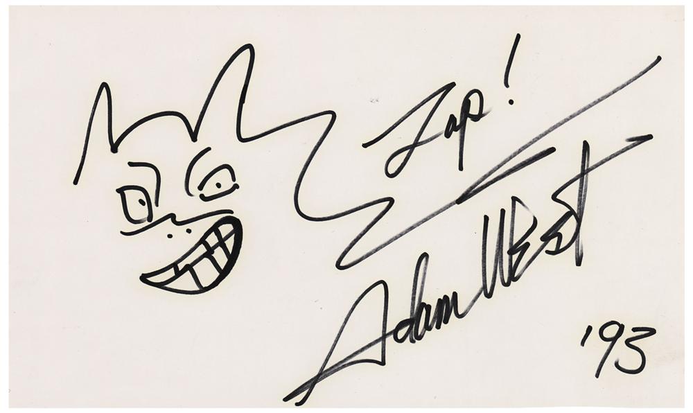 Original sketch of Batman by Adam West, accomplished in felt tip on an off-white 11 x 6.5 sheet that is signed "Zap! Adam West, '93." In fine condition, with faint yellow haloing to the ink.