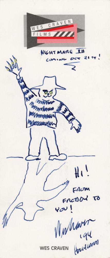 Terrific original sketch by Wes Craven of Freddy Krueger from the Nightmare on Elm Street film series, accomplished in blue ink and yellow highlighter on a white 3 x 7 Wes Craven Films note sheet that is signed, "Hi! From Freddy to you! Wes Craven, '94, Hollywood," with the director adding above, "Nightmare VII coming Oct 21st!" In very fine condition.