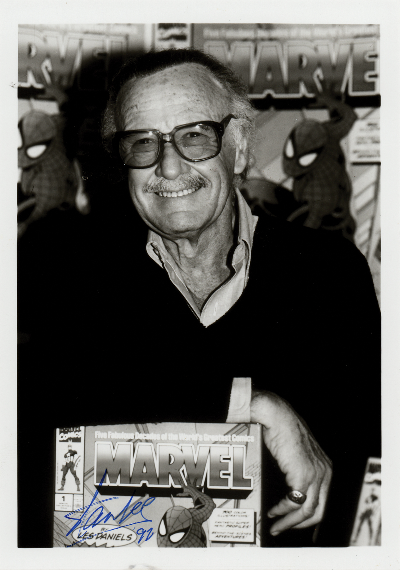 Glossy 5 x 7 photo of the Marvel Comics boss posing with a Spider-Man comic book, signed in blue ink, "Stan Lee, 92." In fine condition, with some light surface stains.