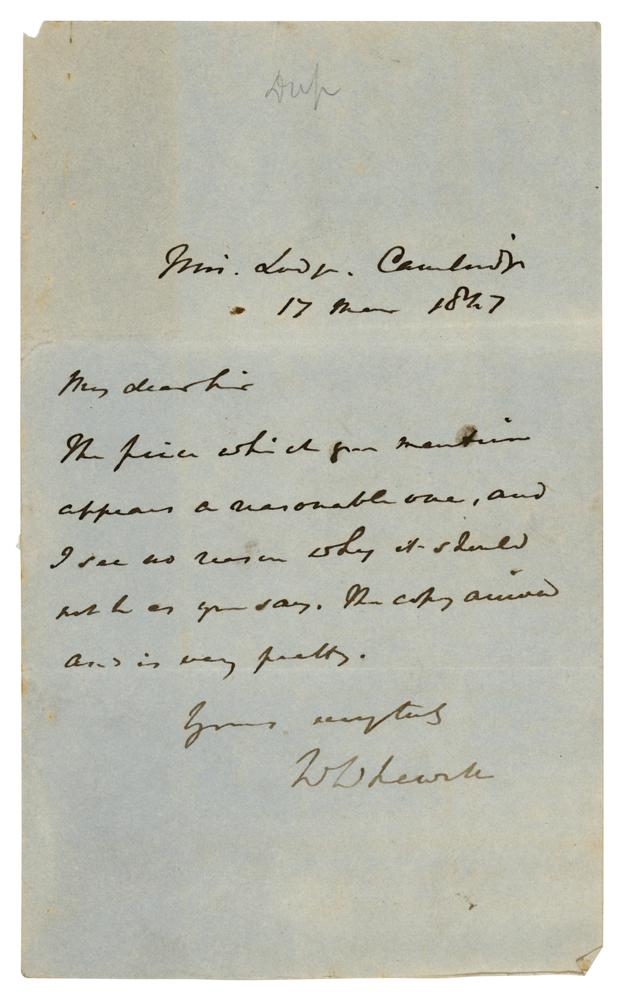 British polymath (1794-1866) who made contributions to theology, philosophy, poetry, architecture, mechanics, physics, geology, astronomy, and economics. He is also remembered for coining several new terms—including 'scientist,' 'physicist,' 'linguistics,' and 'astigmatism,' among others. ALS signed “W. Whewell,” one page, 4.75 x 7.75, March 17, 1847. Handwritten letter to a gentleman, evidently a bookseller. In full: "The price which you mention appears a reasonable one, and I see no reason why it should not be as you say. The copy arrived and is very pretty." In fine condition, with light toning.