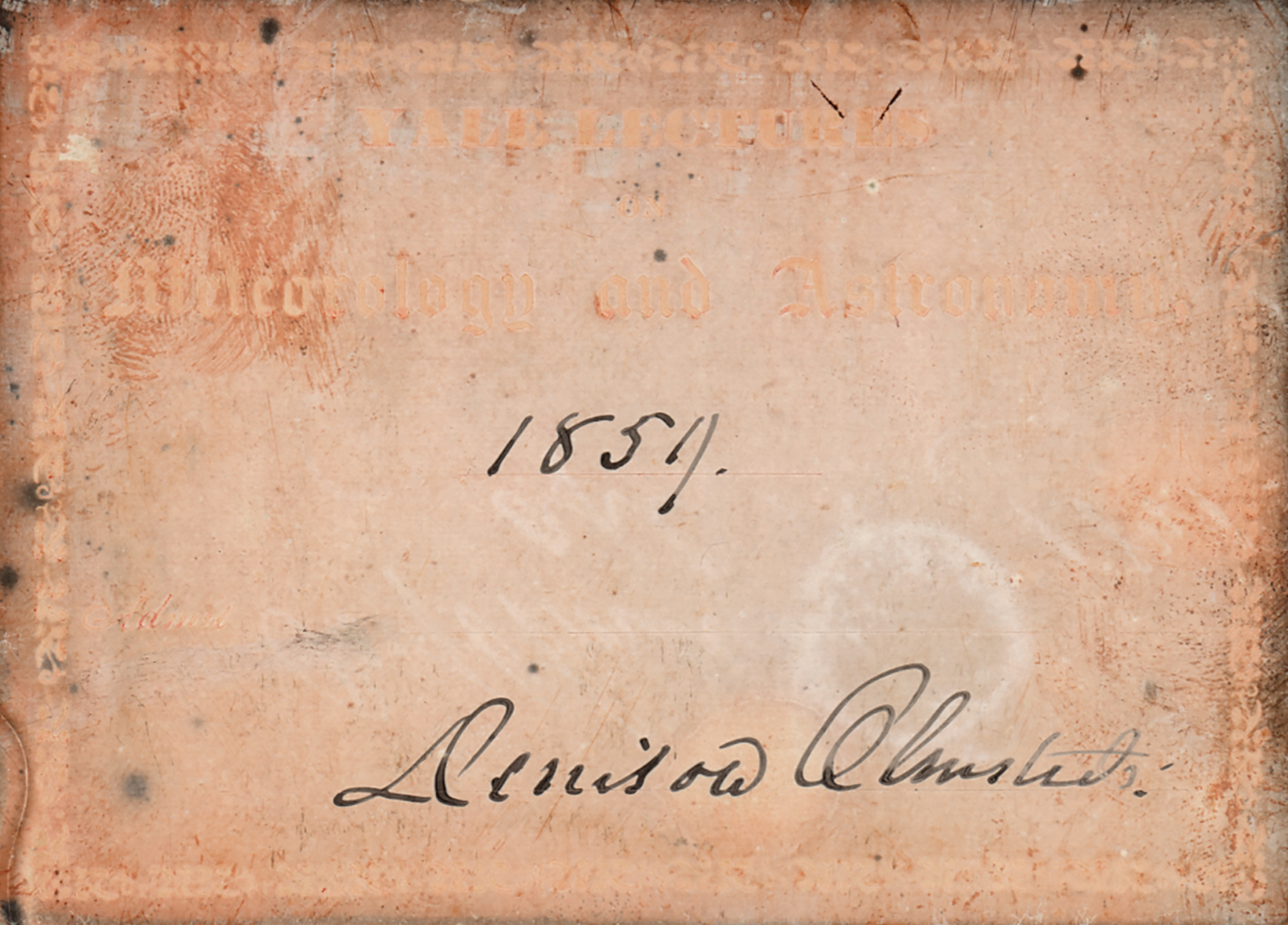 American physicist and astronomer (1791-1859) credited with giving birth to meteor science after the 1833 Leonid meteor shower over North America spurred him to study this phenomenon. Partly-printed admission pass for an 1854 "Yale Lecture on Meteorology and Astronomy," 3.5 x 2.5, neatly signed along the bottom in ink, "Denison Olmsted." In very good condition, with printed text extremely faded and soiling to edges.