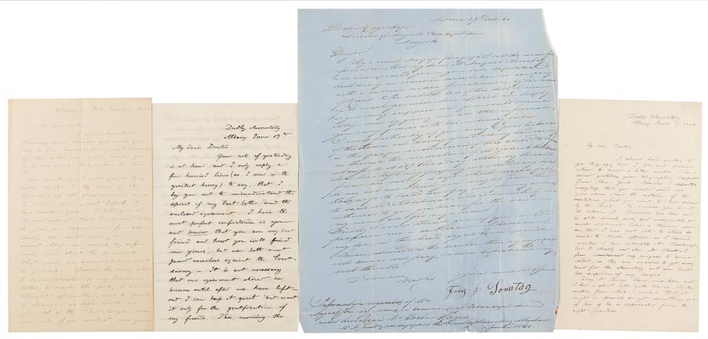 German-American astronomer and polar explorer (1832-1860) who took part in the Second Grinnell expedition led by Elisha Kent Kane in 1853-55, and in Isaac Israel Hayes's 1860-61 attempt to reach the North Pole. While in Greenland as part of the Hayes expedition, he broke through a thin spot in the sea ice and froze to death. Three rare ALSs signed "August Sonntag," totaling seven pages on three sets of adjoining sheets, 5 x 8, dated from 1859-1860. Three significant letters to fellow polar explorer Isaac Israel Hayes, whom he accompanied on his 1861 polar expedition; also includes a letter to Hayes from Sonntag's father, requesting information on his fate. Excerpts: