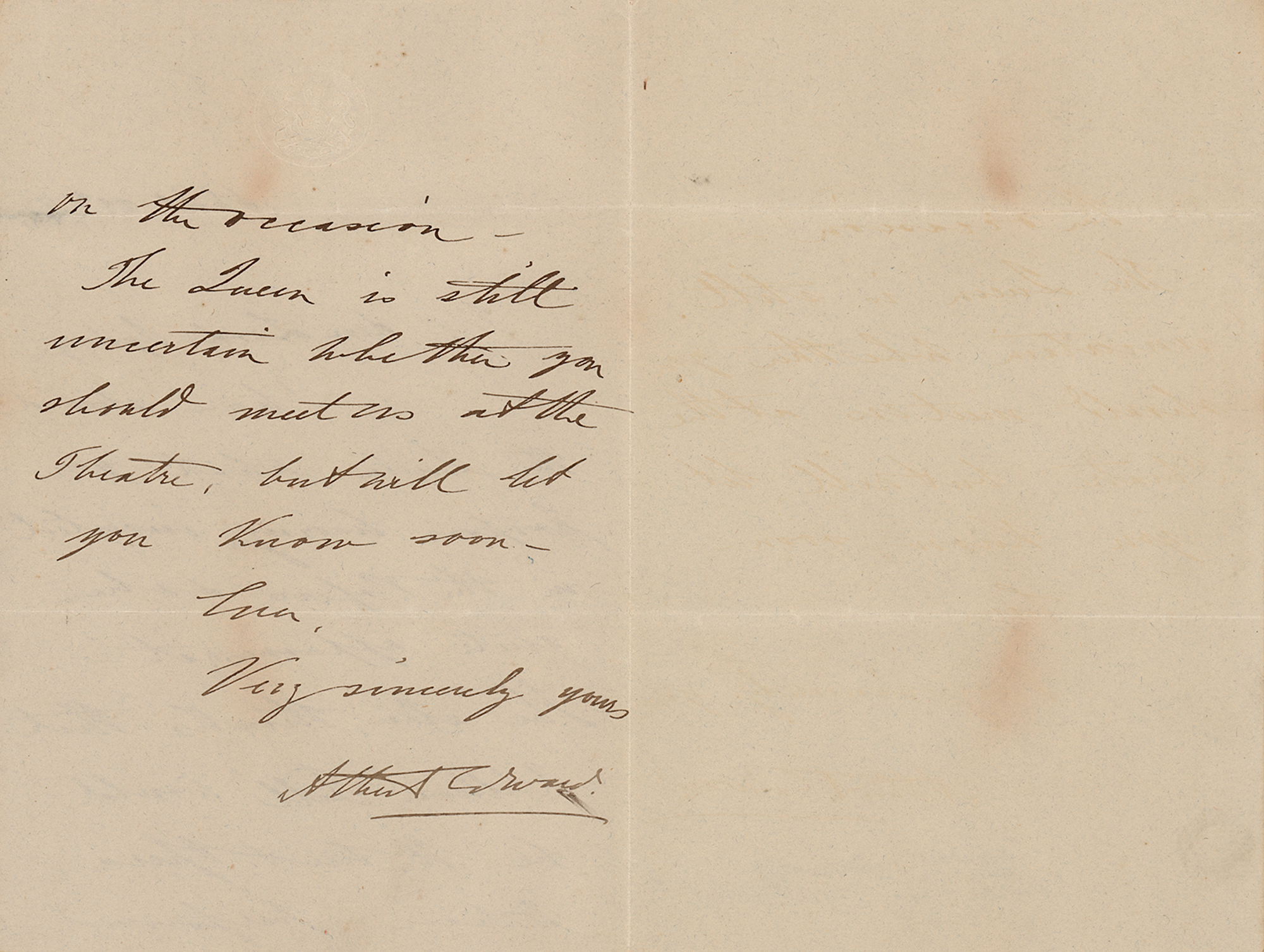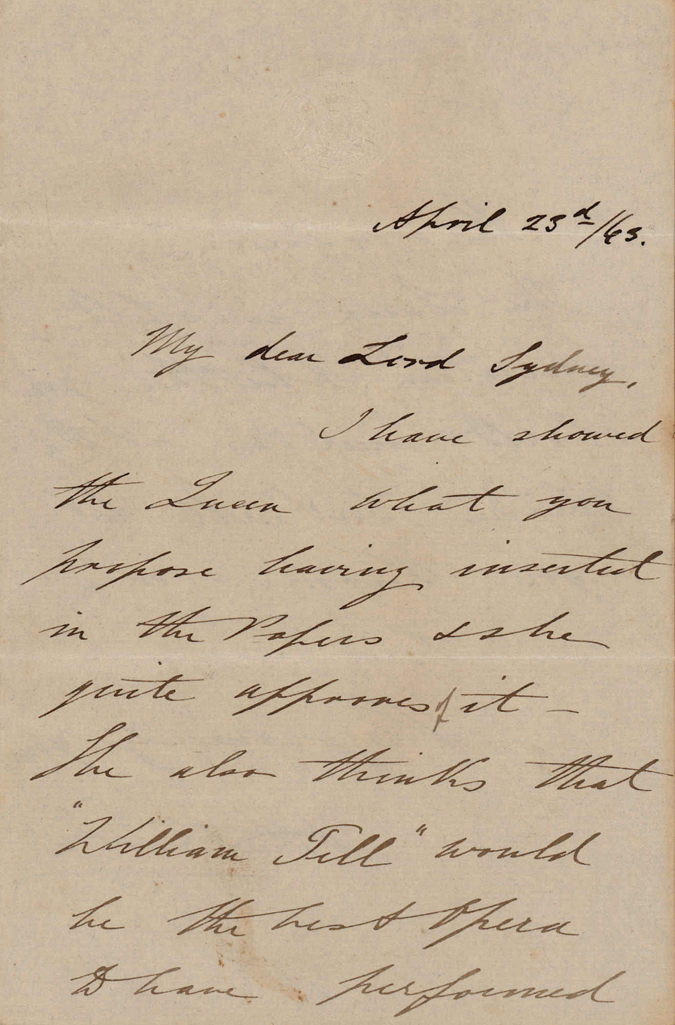 ALS signed “Albert Edward,” one page, 4.75 x 7, embossed Windsor Castle letterhead, April 23, 1865. Handwritten letter to Lord Sydney, communicating information on behalf of his mother, Queen Victoria. In part: "I have showed the Queen what you propose having inserted in the Papers & she quite approves of it—She also thinks that 'William Tell' would be the best opera to have performed on the occasion." In fine condition.