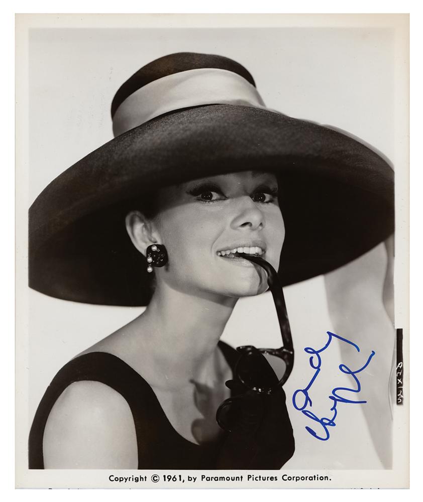 Glossy 8 x 10 Paramount Pictures publicity photo of Audrey Hepburn in her iconic role as Holly Golightly in the 1961 film Breakfast at Tiffany's, signed in blue felt tip. In very good to fine condition, with a faint diagonal bend to the upper left edge, and scattered small surface impressions, several of which touch Audrey's face.