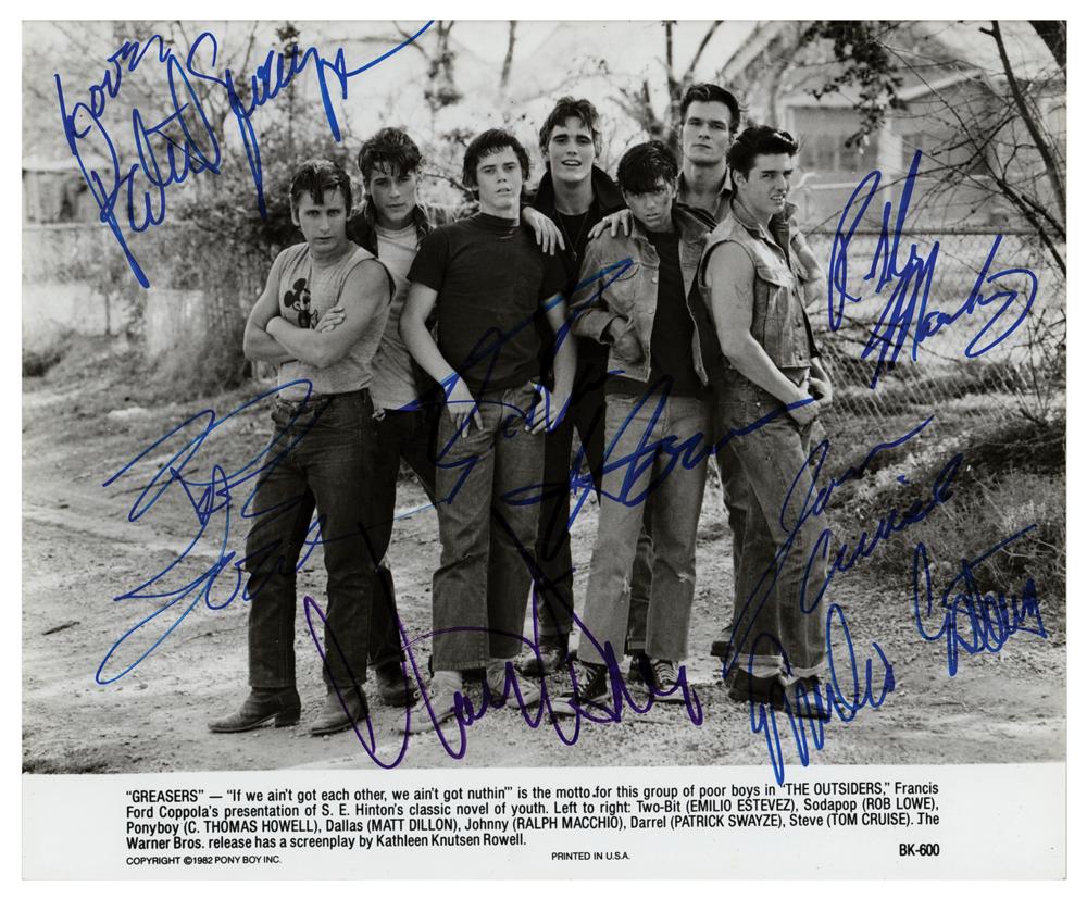 Scarce glossy 9.25 x 7.75 Warner Bros. / Pony Boy publicity photo of the cast of the 1983 film The Outsiders, signed in blue felt tip by Tom Cruise, Patrick Swayze, Emilio Estevez, Rob Lowe, C. Thomas Howell, and Ralph Macchio, and in purple felt tip by Matt Dillon. In fine condition. The consignor that all of the autographs were obtained in person in the early 1980s.