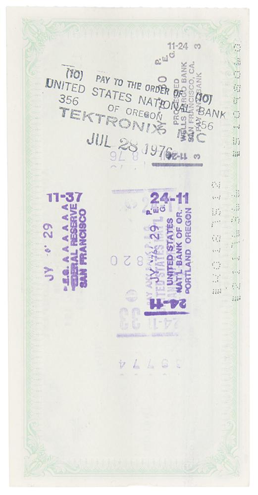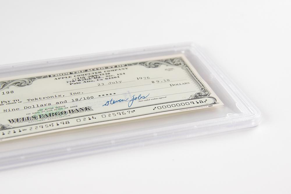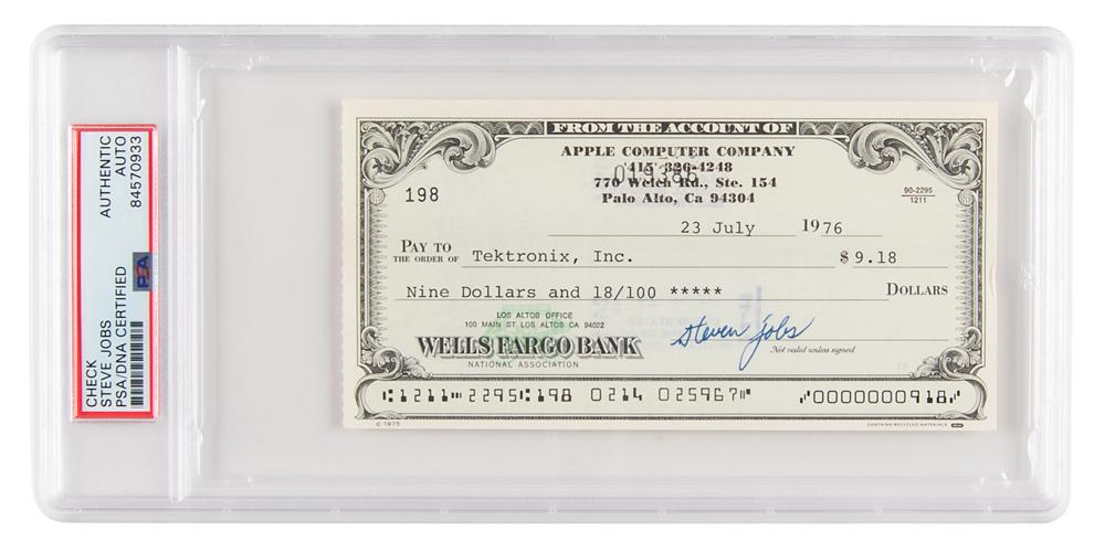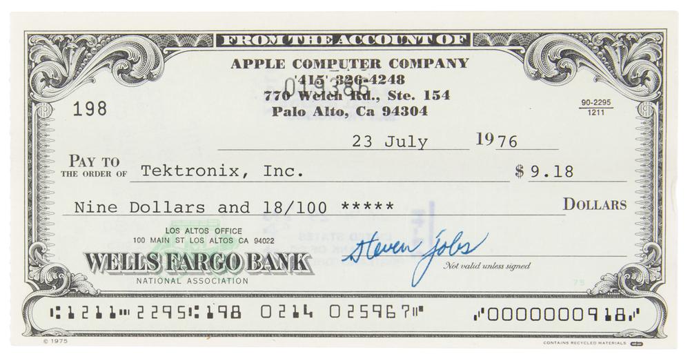 Exceptional Apple Computer Company check, 6 x 3, filled out in type and signed by Jobs, "Steven Jobs," payable to Tektronix, Inc. for $9.18, July 23, 1976. Headed "Apple Computer Company," the check uses Apple's first official address at "770 Welch Rd., Ste. 154, Palo Alto"—the location of an answering service and mail drop that they used while still operating out of the famous Jobs family garage. In very fine condition. Encapsulated in a PSA/DNA authentication holder.