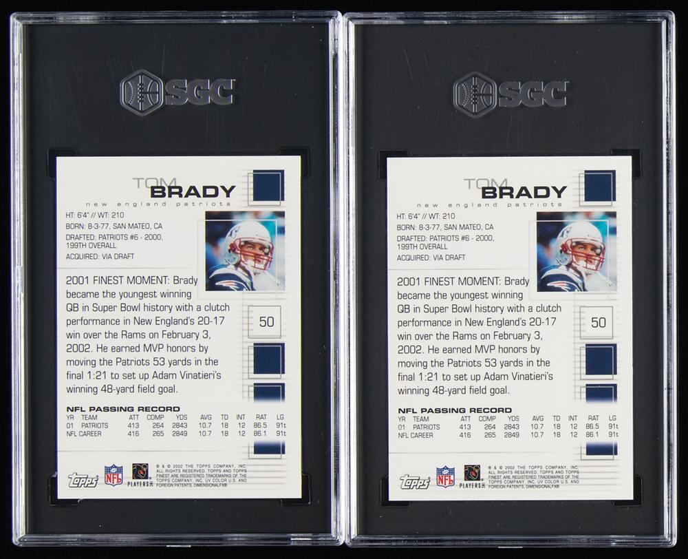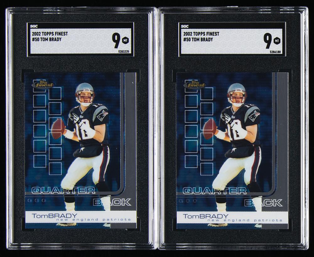 High-grade pairing of cards from the season after Brady became the youngest Super Bowl-winning quarterback in NFL history, both graded by SGC MINT 9.