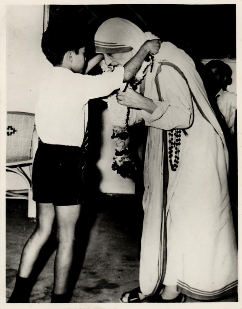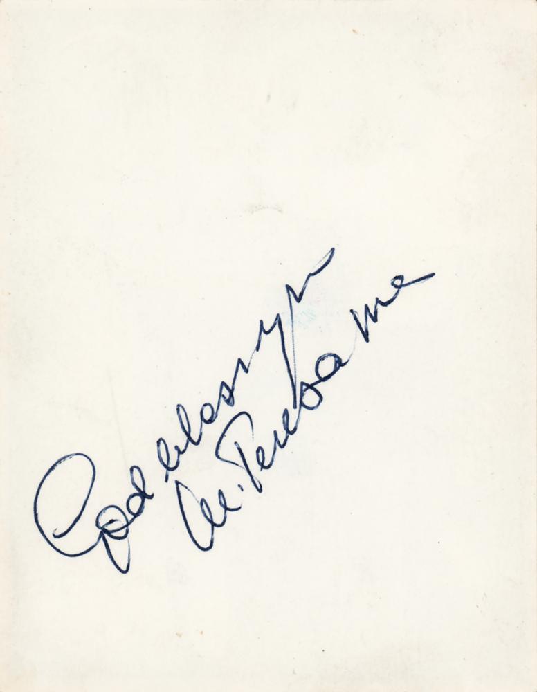 Glossy 3 x 4 photo of Mother Teresa meeting a young boy, signed on the reverse in black ballpoint, "God bless you, M Teresa mc." In fine condition.