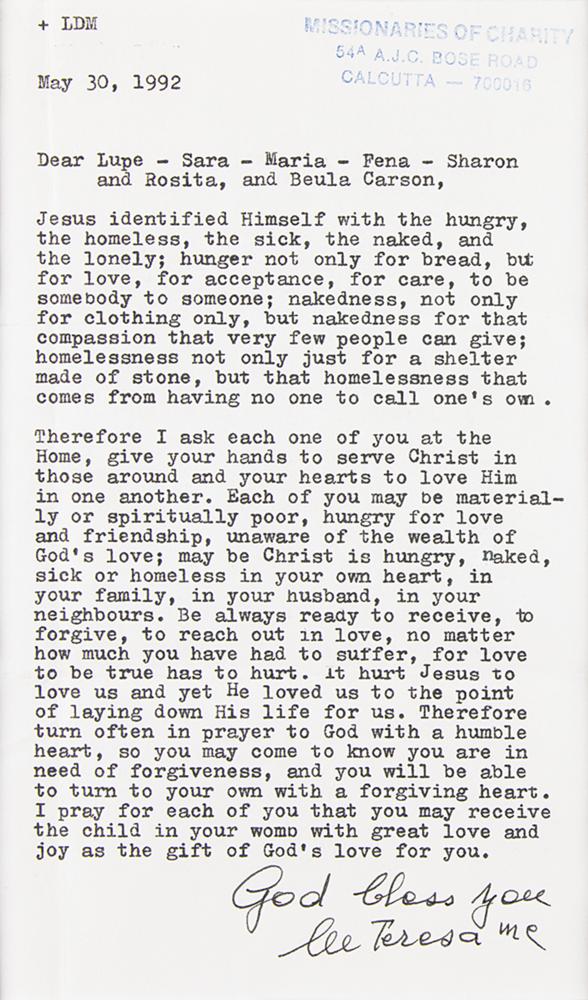 TLS signed “God bless you, M Teresa mc,” one page, 5 x 8.5, stamped Missionaries of Charity letterhead, May 30, 1992. Letter offering a religious message, in part: "Jesus identified Himself with the hungry, the homeless, the sick, the naked, and the lonely; hunger not only for bread, but for love, for acceptance, for care, to be somebody to someone; nakedness, not only for clothing only, but nakedness for that compassion that very few people can give; homelessness not only just for a shelter made of stone, but that homelessness that comes from having no one to call one's own. Therefore I ask each one of you to serve at the Home, give your hands to serve Christ in those around and your hearts to love Him in one another?Be always ready to receive, to forgive, to reach out in love, no matter how much you have had to suffer, for love to be true has to hurt." Matted with a portrait to an overall size of 16 x 12. In fine condition.