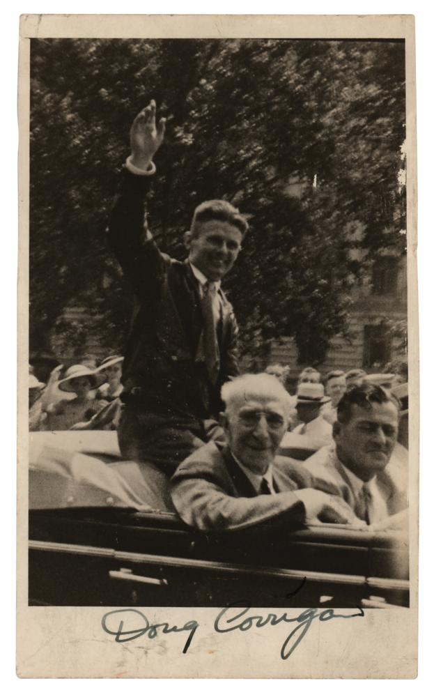 American pilot (1907-1995) best remembered for a 1938 navigational 'error' (now widely believed to have been a purposeful protest against government red tape) that landed him in Dublin instead of his stated destination of California. Vintage matte-finish 3.25 x 5.5 postcard photo of Douglas Corrigan waving to crowds from an automobile following his 'accidental' transatlantic flight in 1938, signed in the lower border in fountain pen, "Doug Corrigan." In fine condition.