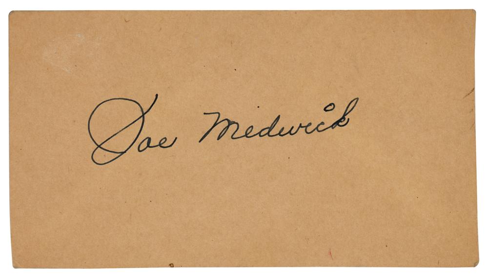 Bold vintage ink signature, "Joe Medwick,” on an off-white 6.25 x 3.5 card. In fine condition.