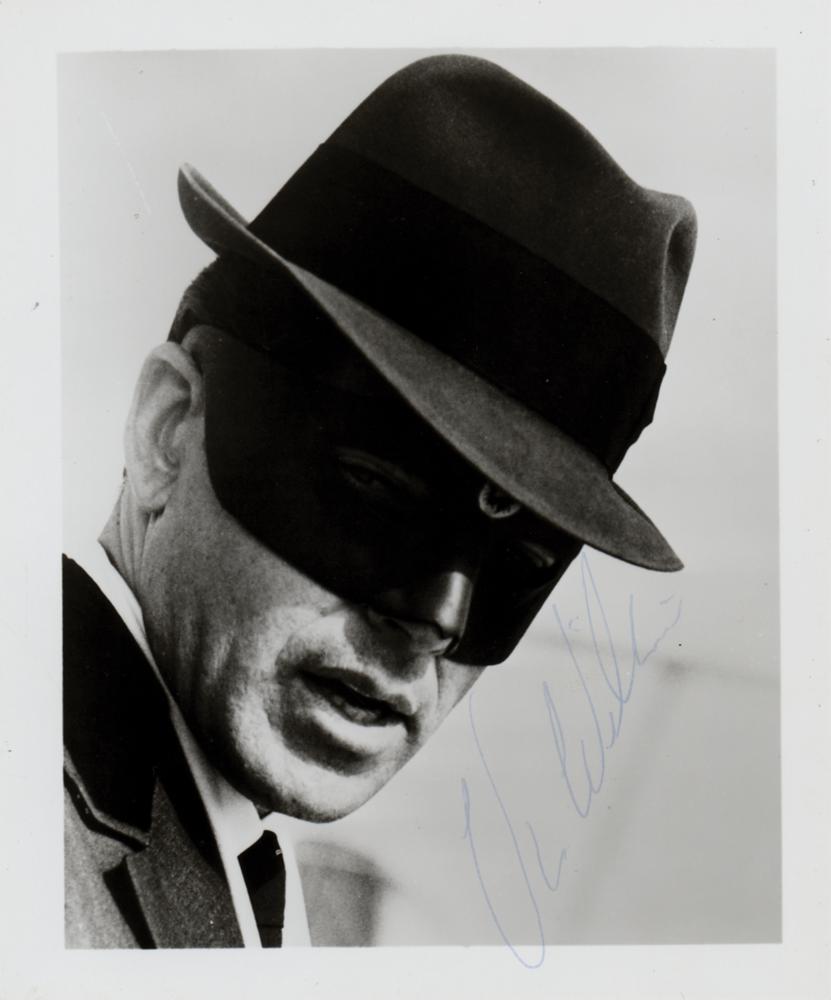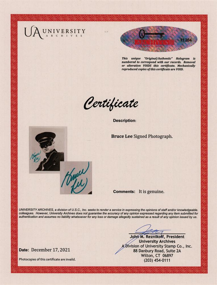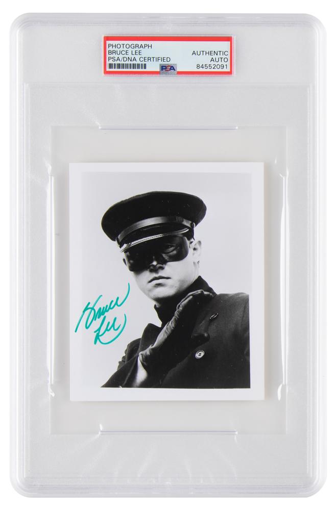 Vintage glossy 4 x 5 photo of Lee as Kato from The Green Hornet television series, boldly signed in green felt tip, "Bruce Lee." In very fine condition. Encapsulated in a PSA/DNA authentication holder and accompanied by a full letter of authenticity from University Archives. Also includes a matching vintage glossy 4 x 5 photo of his co-star Van Williams, signed in blue ballpoint.