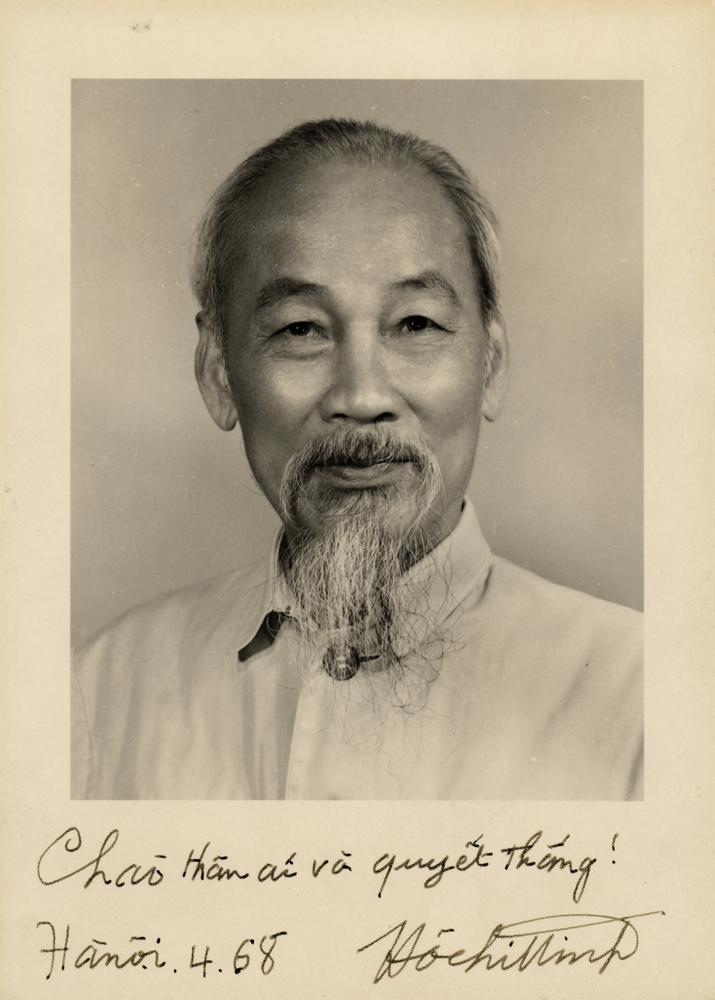 Extremely rare vintage matte-finish 5 x 7.25 head-and-shoulders portrait of Ho Chi Minh, signed in the lower border in black felt tip in Vietnamese with cordial greetings, and dated at Hanoi, April 1968. In fine condition.