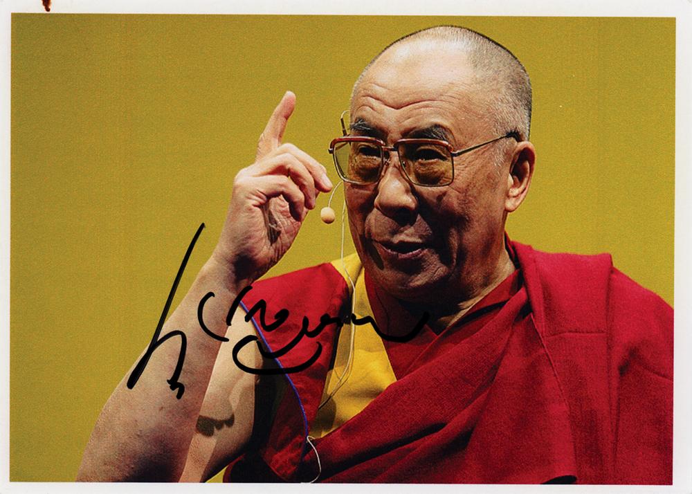 Color glossy 7 x 5 cardstock photo of the Dalai Lama in his iconic red robes, signed in black felt tip. In fine condition, with a small stain and paperclip impression to the top edge.