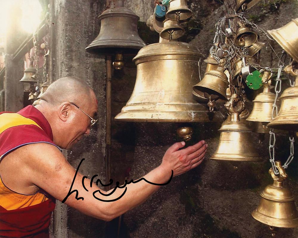 Color glossy 10 x 8 cardstock photo of the Dalai Lama in front of a wall of bells, signed in black felt tip. In fine condition.