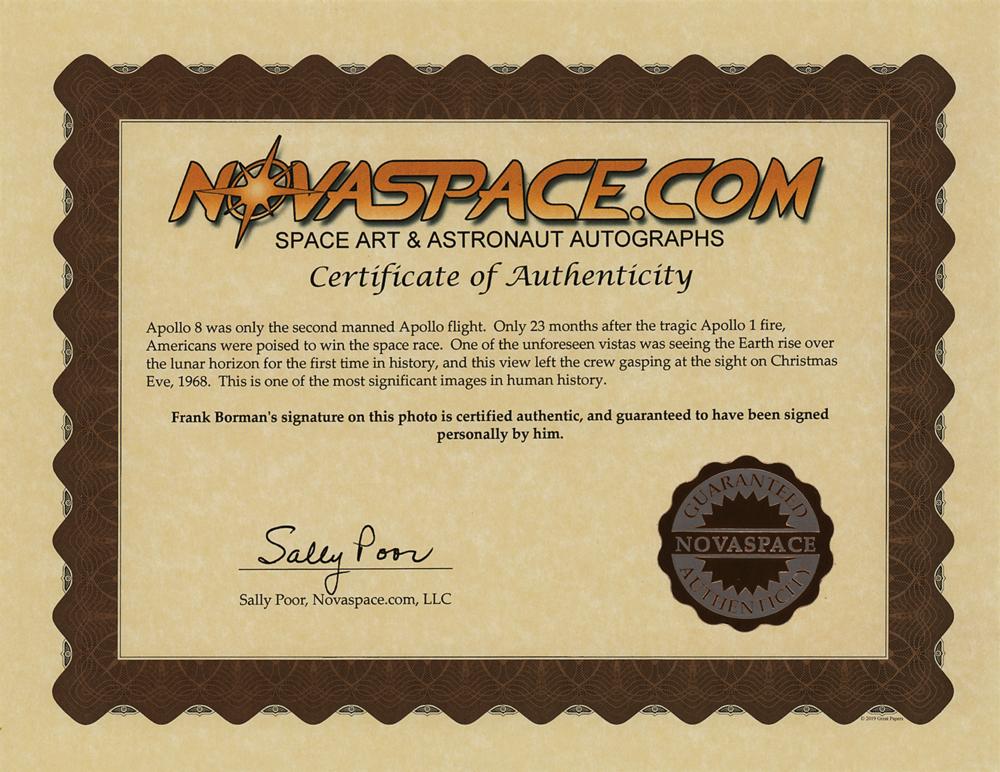 Color satin-finish 10 x 8 photo of the iconic Apollo 8 'Earthrise,' signed neatly in silver ink, "Frank Borman, Apollo 8 CDR." In very fine condition. Accompanied by a certificate of authenticity from Novaspace.