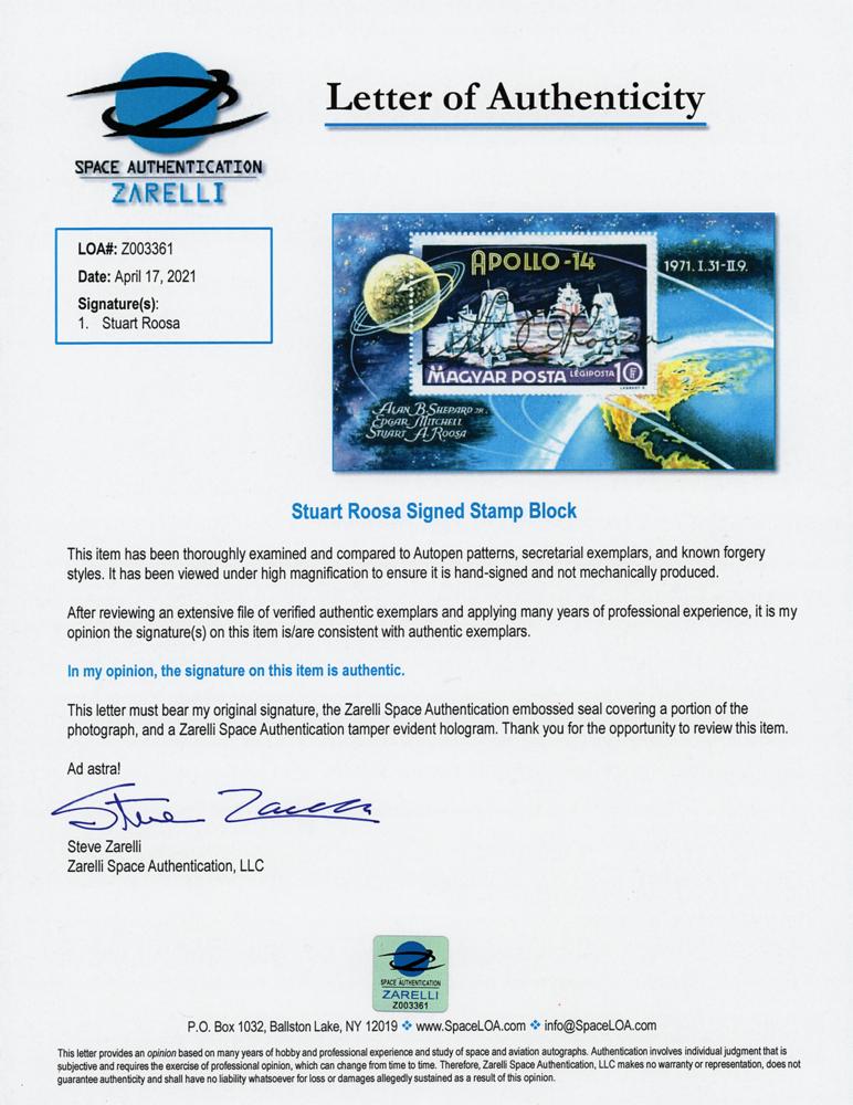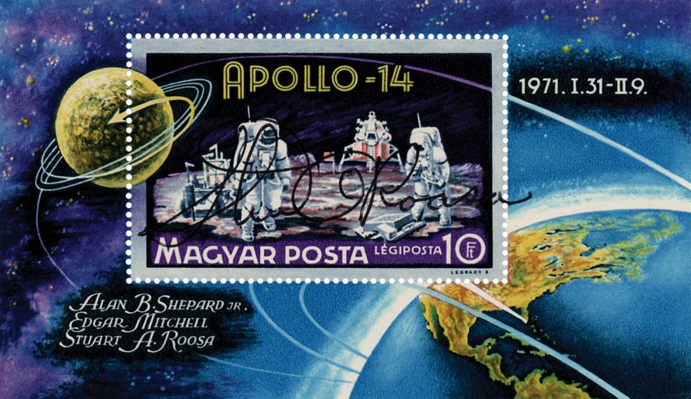 Uncommon unused Hungarian postage stamp, 4.5 x 2.75, with designs honoring the Apollo 14 moon-landing mission, signed across the stamp in black ink, “Stuart A. Roosa.” In very fine condition. Accompanied by a full letter of authenticity from Zarelli Space Authentication.