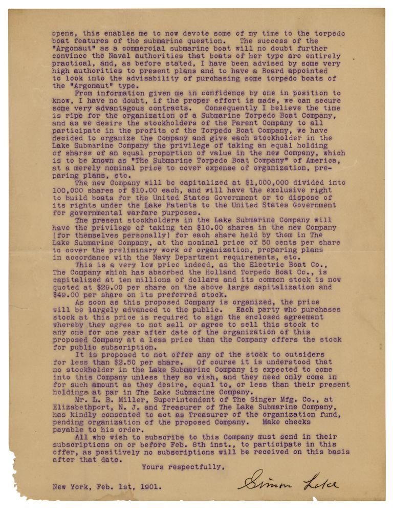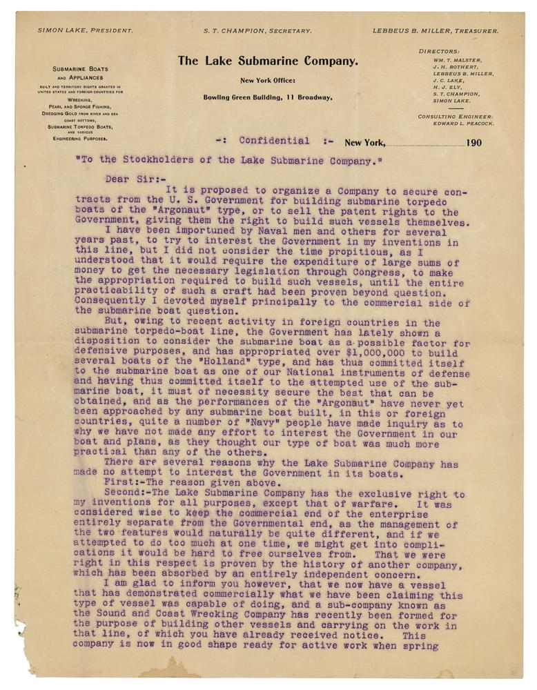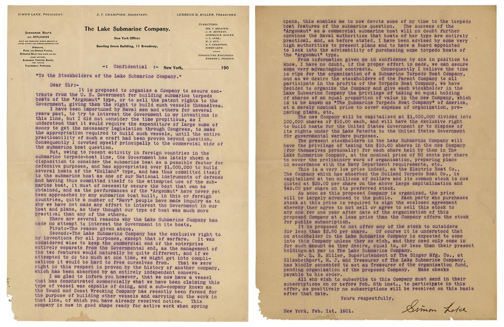 TLS, two pages, 8.5 x 11, The Lake Submarine Company letterhead, February 1, 1901. Letter marked as "Confidential," addressed to a stockholder of the Lake Submarine Company, in part: "It is proposed to organize a Company to secure contracts from the U. S. Government for building submarine torpedo boats of the 'Argonaut' type, or to sell the patent rights to the Government, giving them the right to build such vessels themselves…But, owing to recent activity in foreign countries in the submarine torpedo-boat line, the Government has lately shown a disposition to consider the submarine boat as a possible factor for defensive purposes, and has appropriated $1,000,000 to build several boats of the 'Holland' type, and had thus committed itself to the submarine boat as one of our National instruments of defense." In very good to fine condition, with light creasing and minor corner loss.