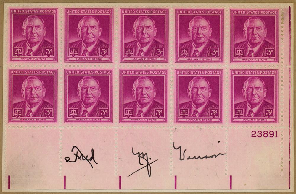 American lawyer and Democratic politician (1890-1953) remembered for his service in all three branches of the United States government: as a Kentucky Congressman, Secretary of the Treasury, and Chief Justice of the Supreme Court. Desirable block of ten 3¢ postage stamps honoring Supreme Court Justice Harlan F. Stone, signed in the lower border in fountain pen, "Fred M. Vinson." Affixed to a slightly larger card and in fine condition.