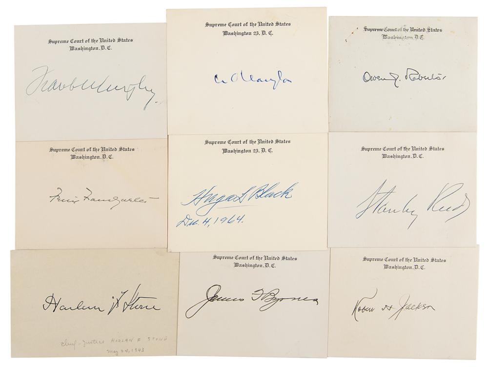 Nine ink signatures of Supreme Court justices, representing the full 1941-42 Stone Court, with all but the chief justice's autograph on official Supreme Court of the United States cards. Includes: Harlan F. Stone, William O. Douglas, Owen J. Roberts, Hugo Black, Robert H. Jackson, Stanley Reed, Felix Frankfurter, James F. Byrnes, and Frank Murphy. In overall fine condition, with staple holes to the Roberts card.