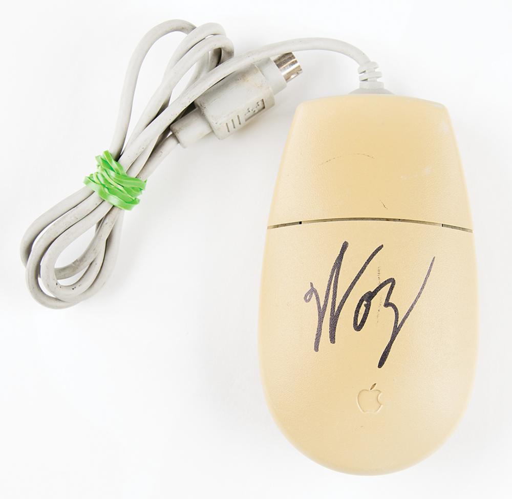 Desirable Apple Desktop Bus Mouse II, representing a major redesign with graceful curves replacing the blocky angles of the previous model, signed on the top in black felt tip by Steve Wozniak, "Woz." In fine condition, with expected age toning.