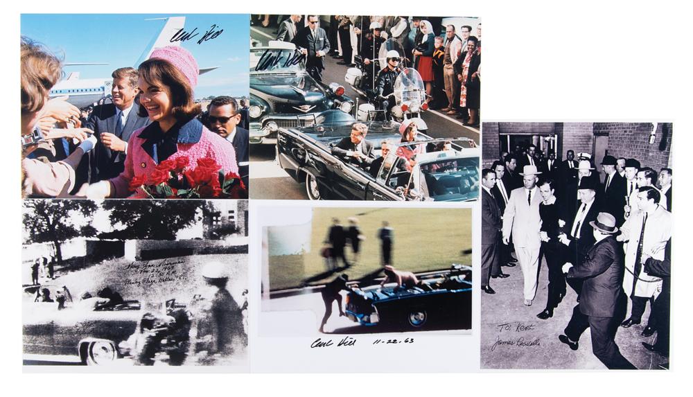 Five photos, glossy and satin-finish, ranging in size from 9.75 x 8 to 8.5 x 11, each with images associated with the assassination of President John F. Kennedy: three signed in black felt tip by Secret Service agent Clint Hill; one signed in black felt tip by witness Mary Moorman, who adds “Nov 22, 1963, 12:30 P.M., Dealey Plaza, Dallas, Tx.”; and one signed in thin black felt tip by Dallas Police Department homicide detective Jim Leavelle, who adds the inscription “To: Kent.” In overall fine condition.