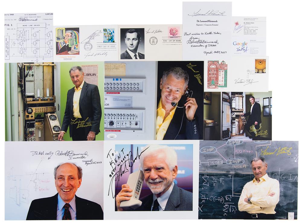 Group lot of 13 items signed by a notable tech innovator, consisting mostly of photos, FDCs, and business cards, including: Vint Cerf (2), Martin Cooper, Robert H. Dennard (3), Bob Kahn, Jack Kilby, and Leonard Kleinrock (6). In overall fine condition.