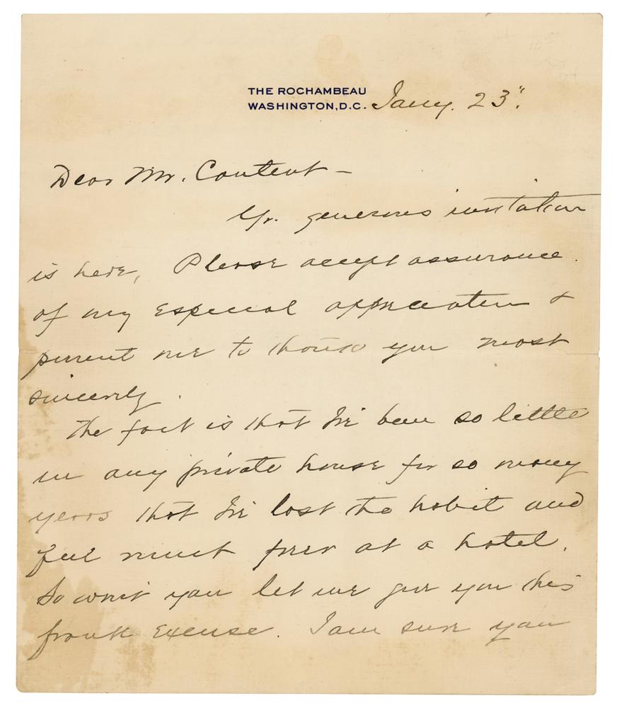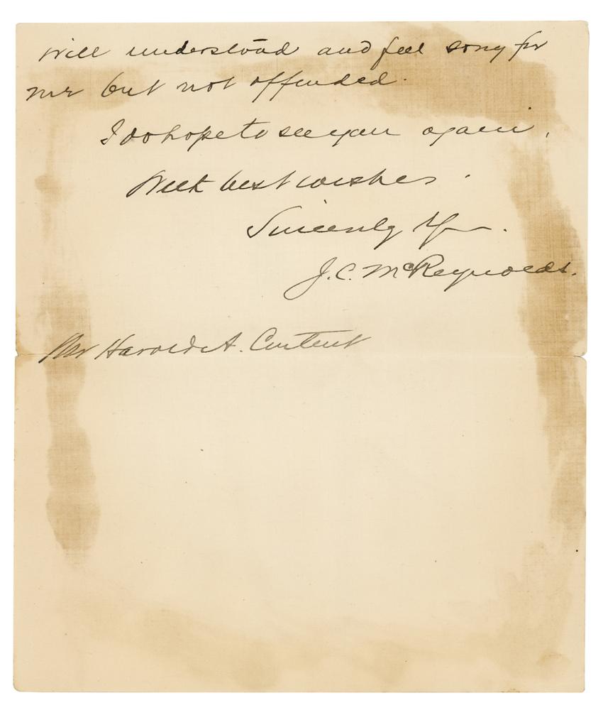 Conservative lawyer and judge (1862-1946) who served on the Supreme Court from 1914 to 1941; due to his bigotry and temperament, McReynolds is often included in lists of the worst Supreme Court justices. ALS signed “J. C. McReynolds,” two pages on two adjoining sheets, 6 x 7.25, The Rochambeau letterhead, January 23. Handwritten letter to a gentleman, in part: "Yr. generous invitation is here, please accept assurance of my especial appreciation & permit me to thank you most sincerely. The fact is that I've been so little in any private house for so many years that I've lost the habit and feel much freer at a hotel?I am sure you will understand and feel sorry for me but not offended." In very good to fine condition, with moderate staining, especially to the second page.