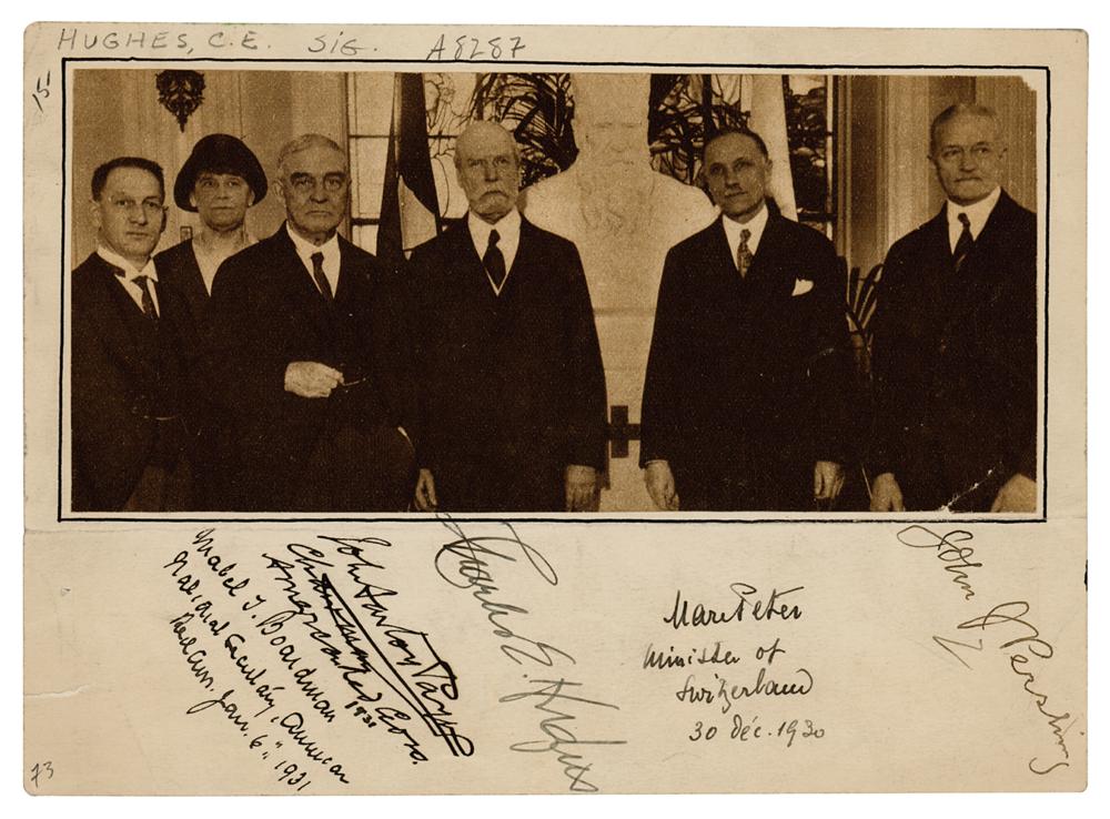Clipped newspaper or magazine photo of John J. Pershing and Charles Evans Hughes standing with Red Cross chairman John Barton Payne, Red Cross secretary Mabel Boardman, and Swiss diplomat Marc Peter, affixed to a 7 x 5 sheet, boldly signed below the image in ink by all five. In fine condition, with a horizontal fold just beneath the image, and some slight wrinkling to the image.