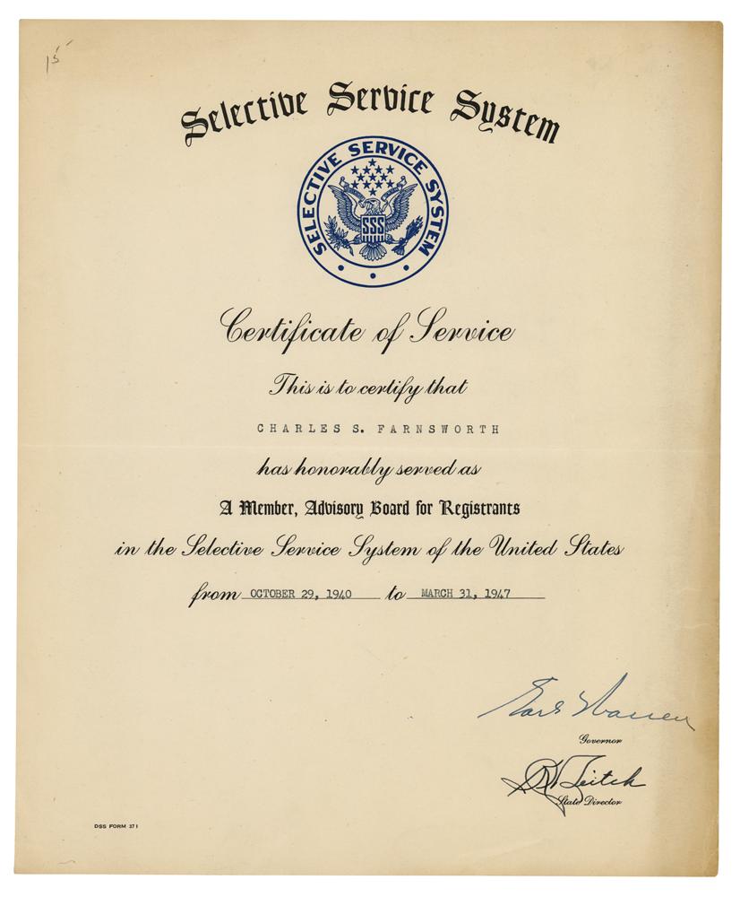 DS, one page, 9.25 x 11.25, March 31, 1947. Selective Service System certificate issued by Earl Warren as governor of California, in part: "This is to certify that Charles S. Farnsworth has honorably served as A Member, Advisory Board for Registrants, in the Selective Service System of the United States." In fine condition, with light creasing and toning to edges.