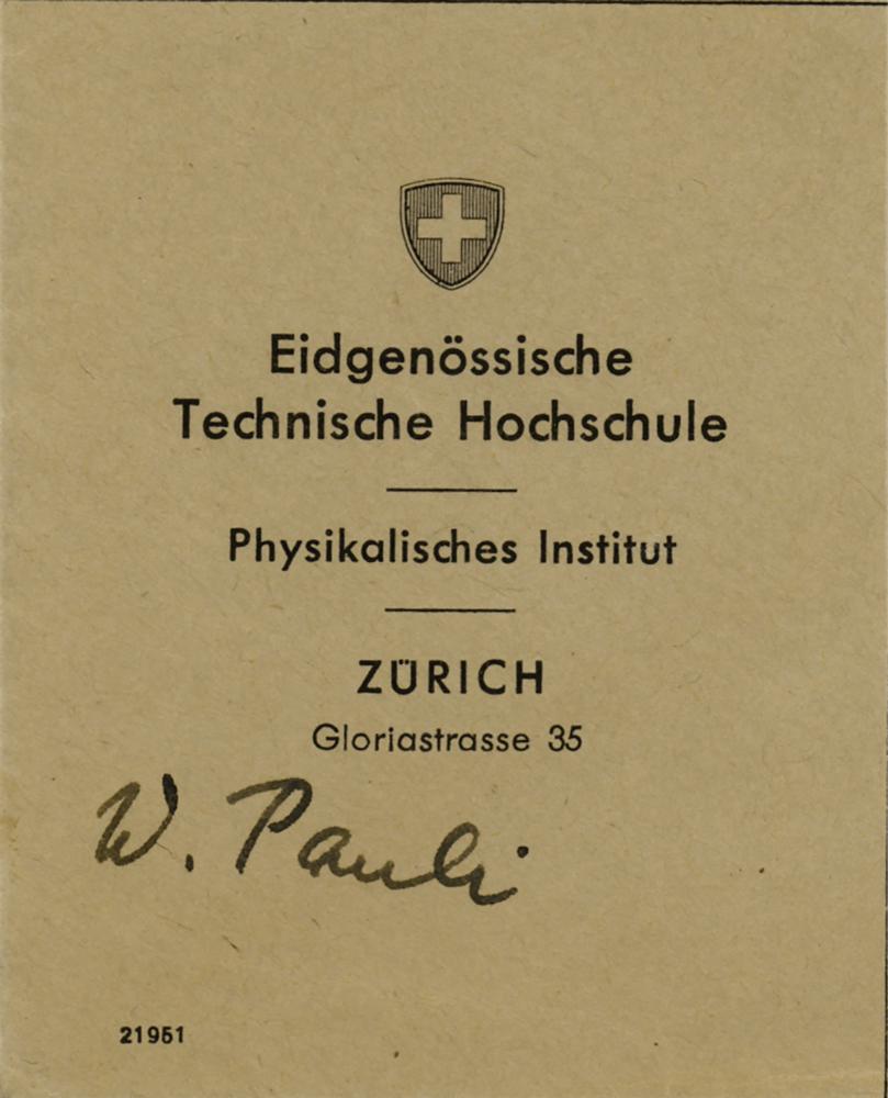 Pioneer of quantum physics (1900-1958) who received the Nobel Prize in Physics in 1945 after being nominated by Albert Einstein. Fountain pen signature, "W. Pauli,” on an off-white 2.5 x 3 slip from the Physics Institute at the Swiss Federal Institute of Technology in Zurich. In fine condition. Pauli was Professor of Theoretical Physics at ETH Zurich from 1928 until his death in 1958.