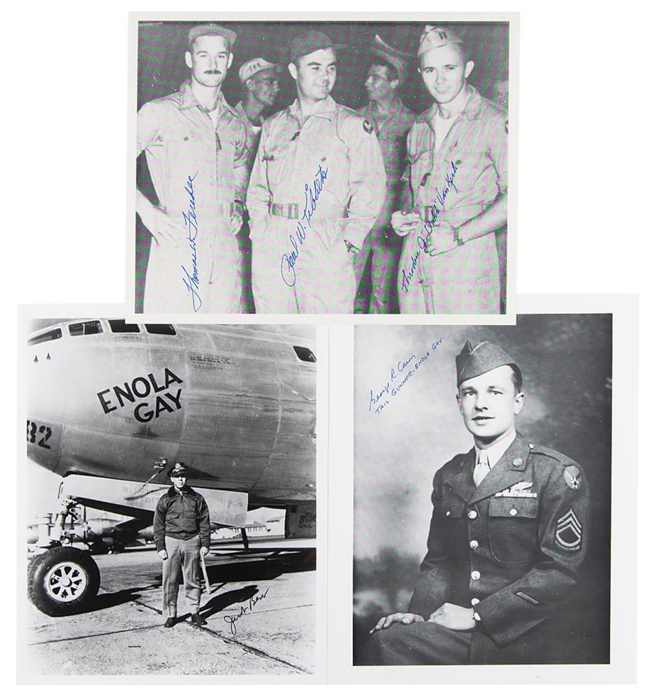 Three items: a cardstock 10 x 8 photo of the Enola Gay crew, signed in blue felt tip by Paul Tibbets, Thomas Ferebee, and Theodore J. 'Dutch' Van Kirk; a cardstock 8 x 10 photo of George Caron, signed in blue felt tip, "George R. Caron, Tail Gunner - Enola Gay"; and a glossy 8 x 10 photo of radar specialist Jacob Beser in front of the Enola Gay, signed in black felt tip, "Jacob Beser." In very fine condition.