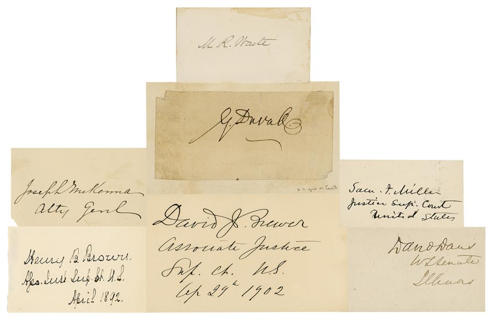 Seven ink signatures of Supreme Court justices of the 19th century, including: Gabriel Duvall, David Davis, Morrison R. Waite, Samuel F. Miller, David J. Brewer, Joseph McKenna, and Henry Billings Brown. In overall fine condition.