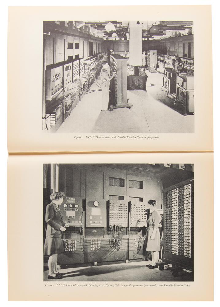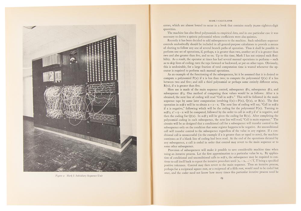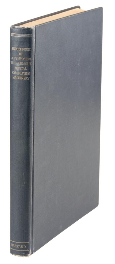 Uncommon book: Proceedings of a Symposium on Large-Scale Digital Calculating Machinery, Jointly Sponsored by The Navy Department Bureau of Ordnance and Harvard University at The Computation Laboratory, 7-10 January 1947. Cambridge, MA: Harvard University Press, 1948. Hardcover, 8.25 x 10.75, 302 pages. The book covers the eight sessions of the symposium, which discussed existing calculating machines; the logic of large-scale calculating machinery; storage devices; numerical methods and suggested problems for solution; sequencing, coding, and problem preparation; and input and output devices. Published in the volume are discussions of the work of Charles Babbage, the IBM Mark I calculator, the ENIAC, and other significant topics. In fine condition, with minor edgewear and rubbing to boards.