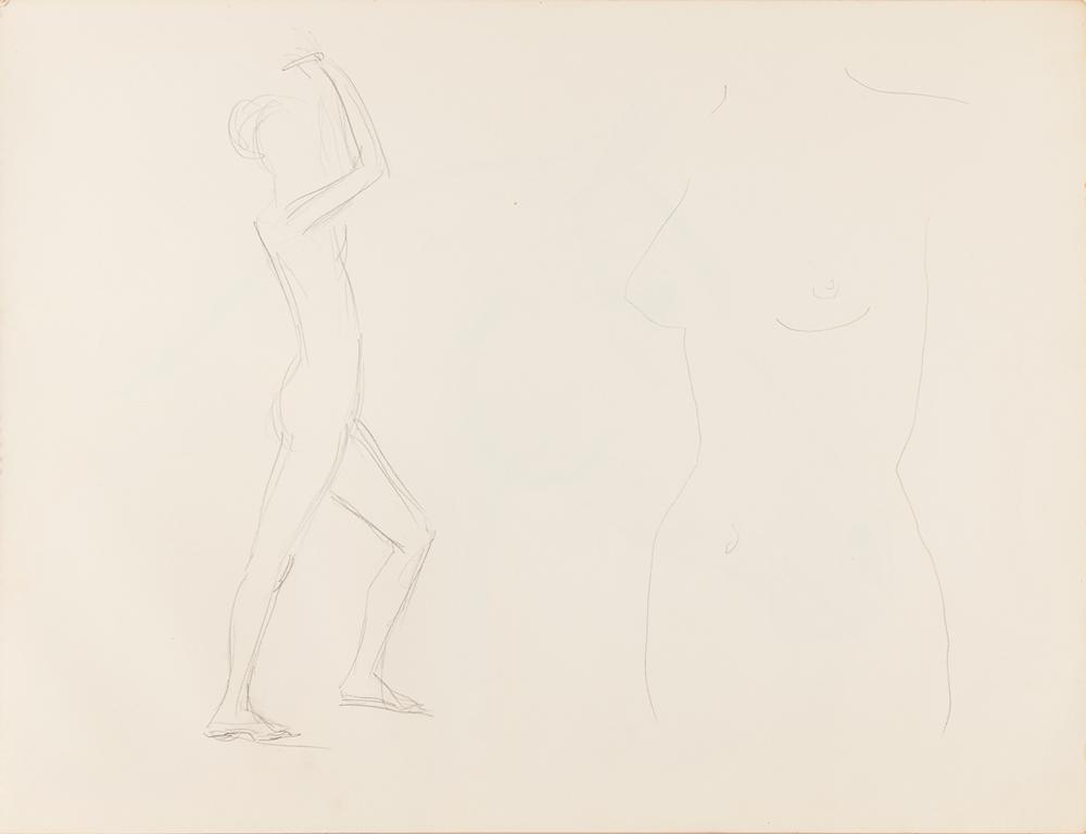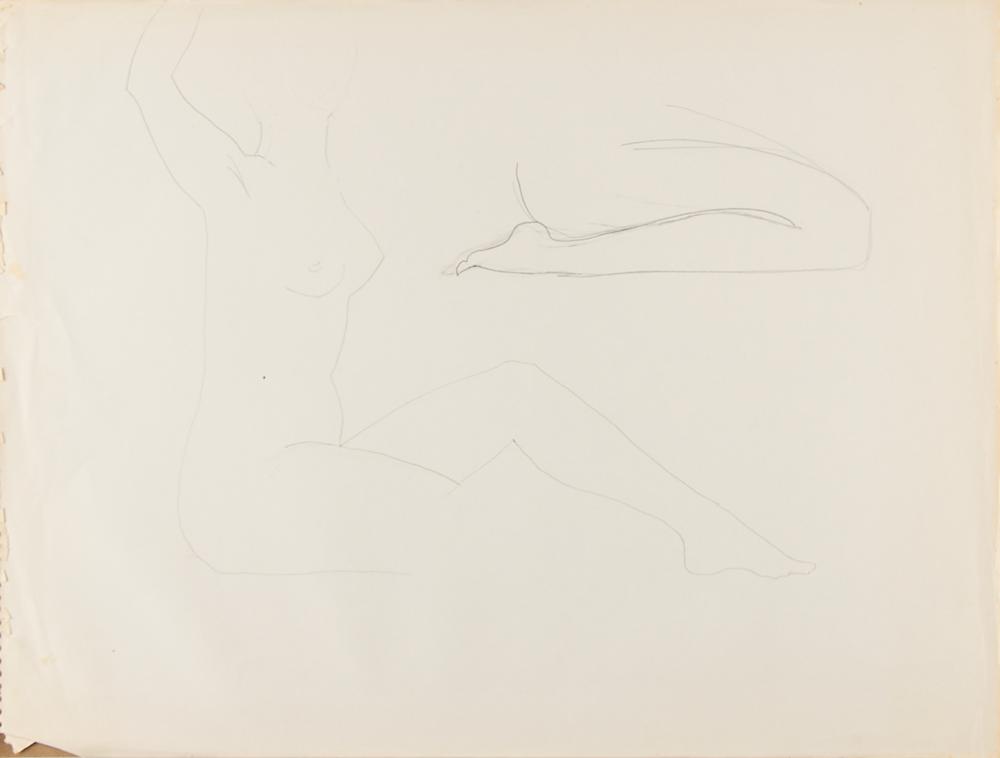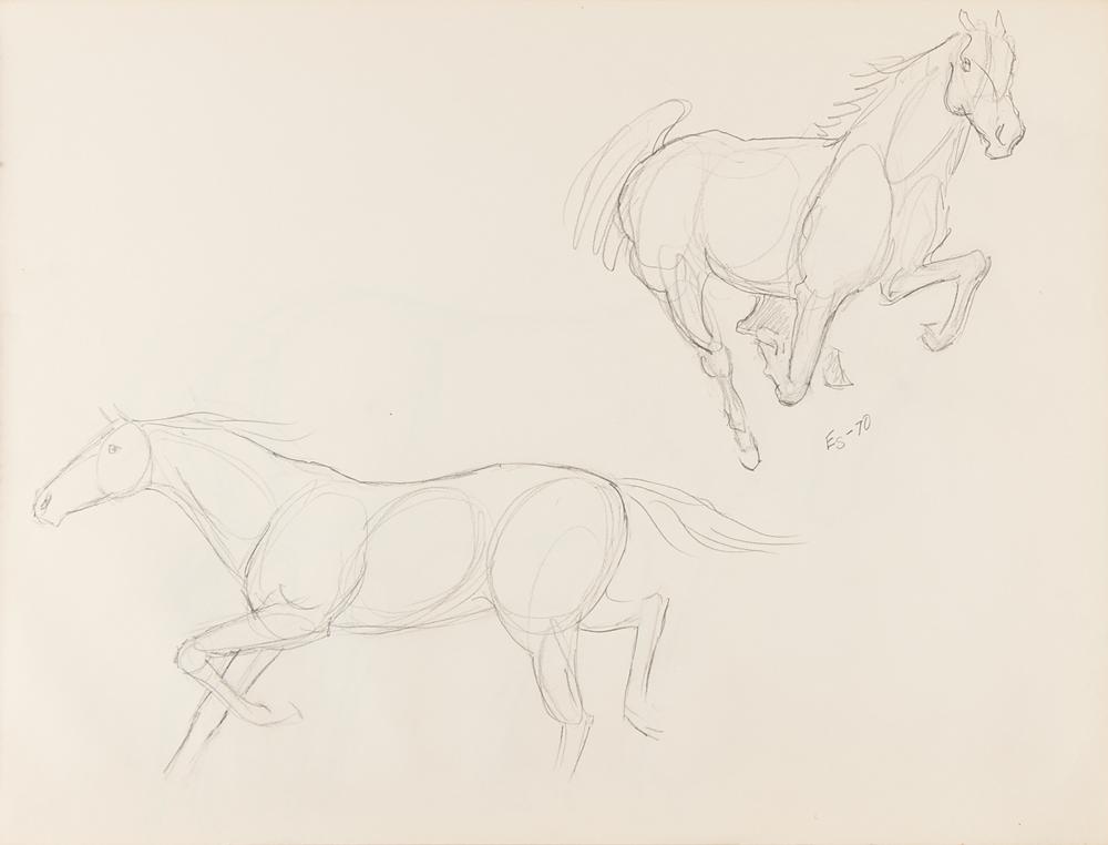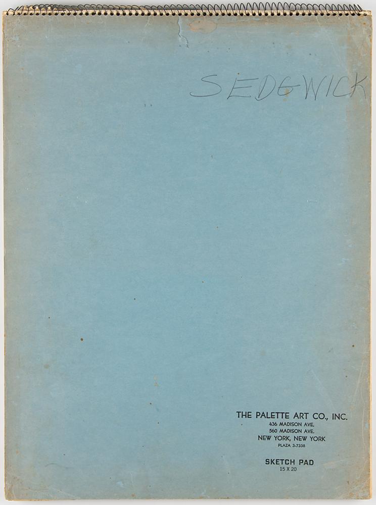 Spiral-bound 15 x 20 sketch pad belonging to Edie Sedgwick, dating to 1970, which contains a total of 13 original drawings in graphite, with Sedgwick adding her artist signature to four in different variations: ?EMS-70,? ?ES-70,? and ?ES-1970.? The pad?s detached front cover also bears her last name across the top: ?Sedgwick.? While the majority of the subjects are of horses, Sedgwick also includes drawings of an infant suckling its thumb, an angel figurine, a monkey and goat, several nude figure studies, a double light switch with the inscription, ?For Bobby,? and a portrait of novelist Truman Capote. In fine condition, with scattered toning, edge tears, creases, and some stains, mainly to the detached front cover and the first page with infant (the majority of the sketches are entirely unaffected).