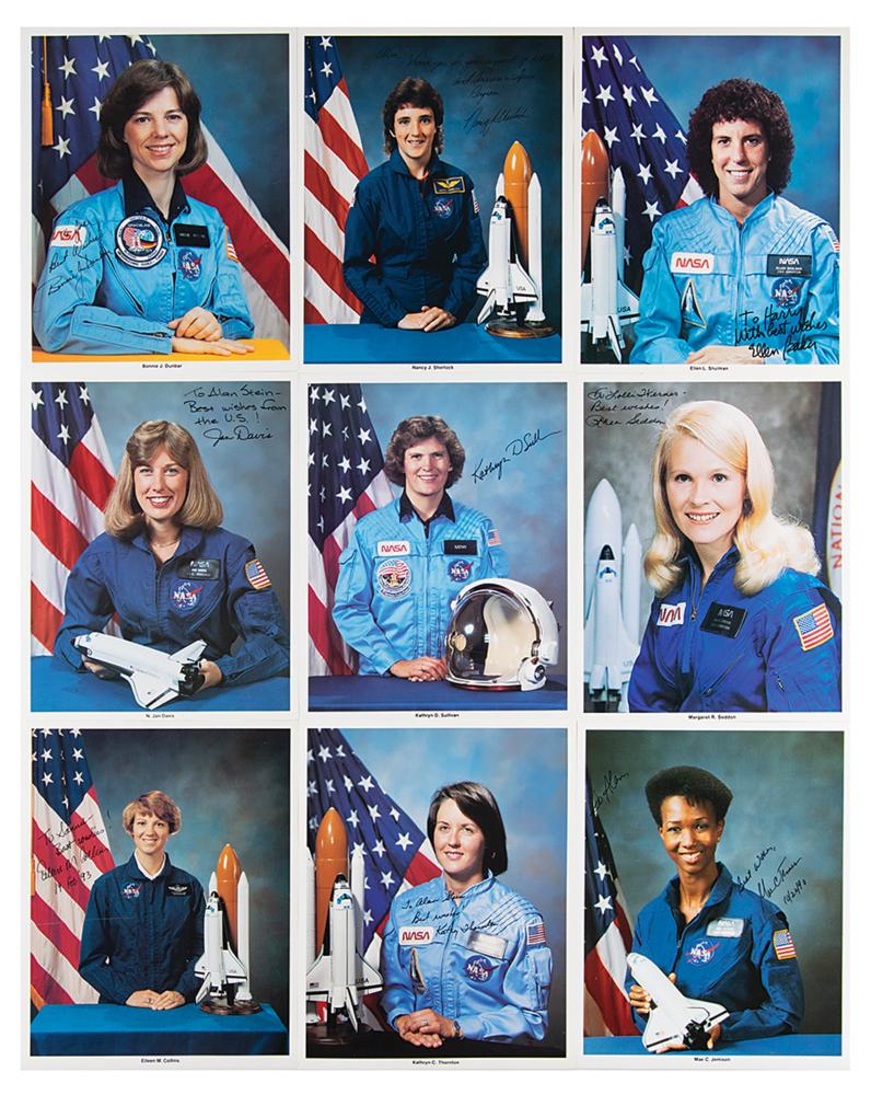 Nice group of nine official color 8 x 10 NASA lithographs of women astronauts, each signed in ink by the subject, with most inscribed. Includes: Mae Jemison, Eileen Collins, Kathryn C. Thornton, Jan Davis, Bonnie J. Dunbar, Kathryn D. Sullivan, Rhea Seddon, Nancy J. Sherlock, and Ellen L. Shulman. In overall fine condition, with light creasing to the Collins.