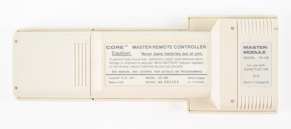 Uncommon CL 9 CORE UC-100 remote control, serial no. 005368, developed by Steve Wozniak as the first programmable universal remote control. Based on the MOS 6502 microprocessor—the same one used in the Apple II—the remote features an LCD display, numeric keypad, and function buttons. It is a 'learning' remote control, able to record and replay IR signal patterns from other proprietary remotes. A serial interface on the underside allows it to connect to a computer, and each button is programmable as a macro for multiple operations. Untested and in fine cosmetic condition.