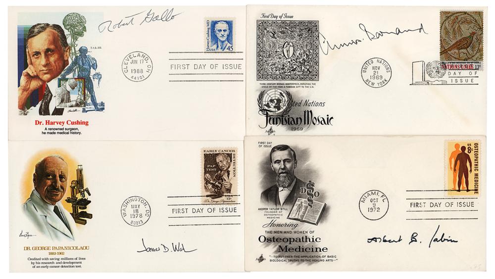 Four FDCs signed in ink by noted medical researchers, including: DNA co-discoverer James D. Watson; polio vaccine researcher Albert B. Sabin; cardiac surgeon Christiaan Barnard; and HIV co-discoverer Robert Gallo. In overall fine condition.