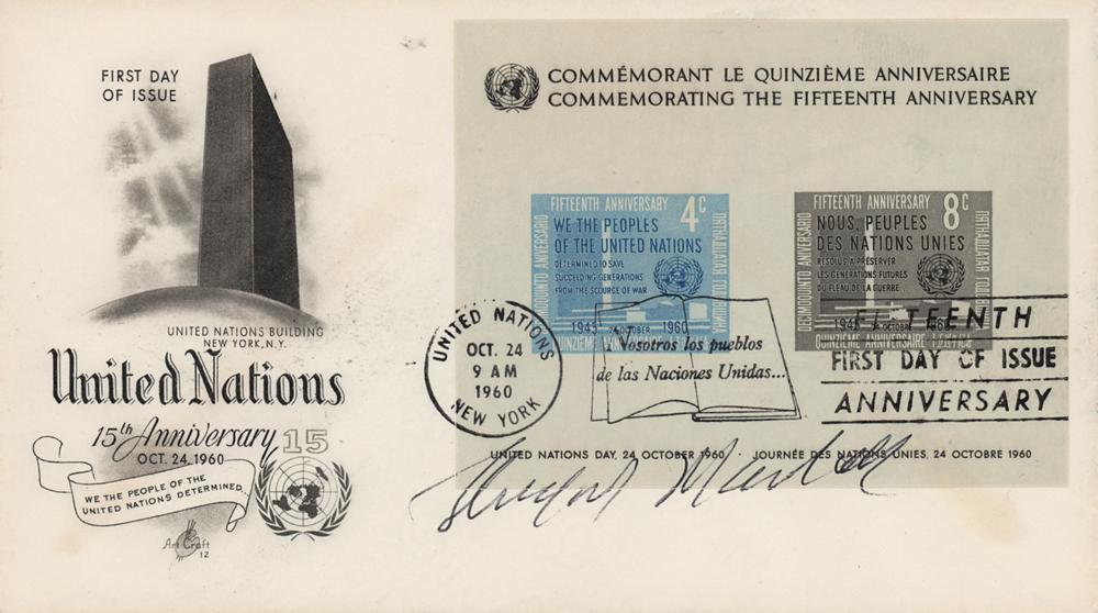 FDC with a cachet honoring the 15th anniversary of the United Nations, signed in black ballpoint by Thurgood Marshall. In fine condition.