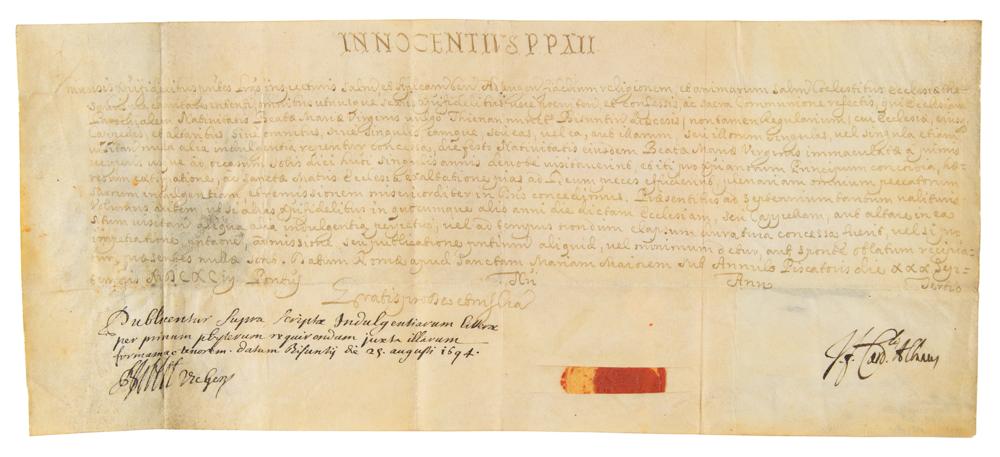 Italian pope (1649-1721), born Giovanni Francesco Albani, who ascended the papal throne in 1700 and served until his death. Vellum manuscript DS in Latin, signed “G. F. Cardle Albani,” one page, 14.5 x 6.25, August 29, 1694. Papal breve in the name of Pope Innocent XII, signed by Giovanni Francesco Albani on behalf of Pope Innocent XII while serving as Secretary of State. Albani served as Secretary of State for Pope Innocent XI, Pope Alexander VIII, and Pope Innocent XII. In fine condition, with three heavy vertical folds.