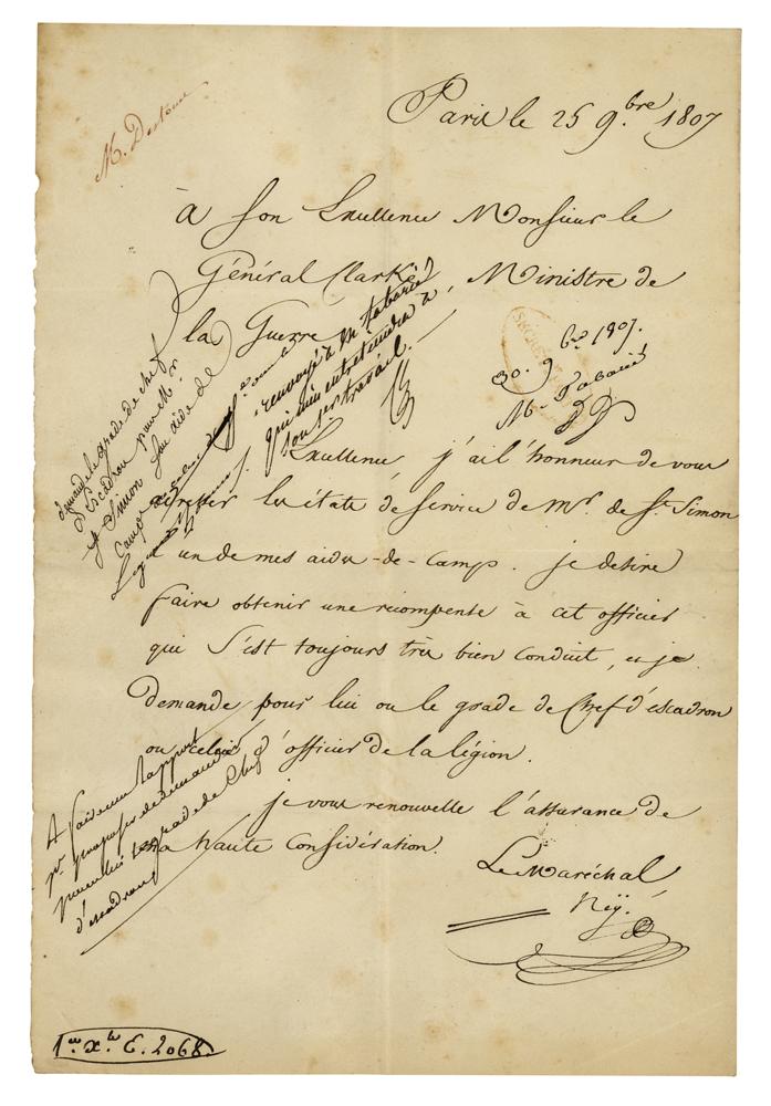 French soldier and military commander during the French Revolutionary Wars and the Napoleonic Wars (1769-1815) who was one of the original 18 Marshals of France created by Napoleon; he commanded the Old Guard at Waterloo but was tried and condemned for treason by the Chamber of Peers and executed. LS in French, signed “Ney,” one page, 8 x 12, November 25, 1807. Untranslated letter to Minister of War Henri Jacques Guillaume Clarke, signed at the conclusion by Marshal Ney. In fine condition.
