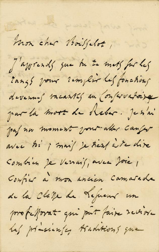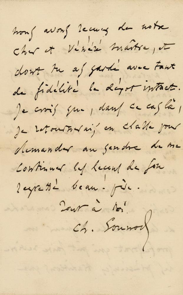 French composer (1818-1893) best remembered for his composition of 'Ave Maria.' ALS in French, signed “Ch. Gounod,” two pages both sides, 4.5 x 7, no date. Untranslated handwritten letter to the French composer and musical-instrument manufacturer Xavier Boisselot. In fine condition. Accompanied by the original mailing envelope, addressed in Gounod's hand.
