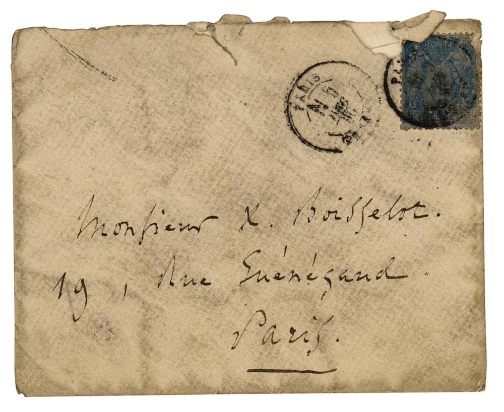 French composer (1818-1893) best remembered for his composition of 'Ave Maria.' ALS in French, signed “Ch. Gounod,” two pages both sides, 4.5 x 7, no date. Untranslated handwritten letter to the French composer and musical-instrument manufacturer Xavier Boisselot. In fine condition. Accompanied by the original mailing envelope, addressed in Gounod's hand.