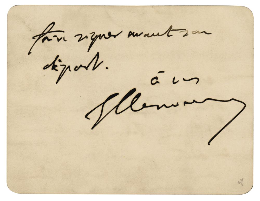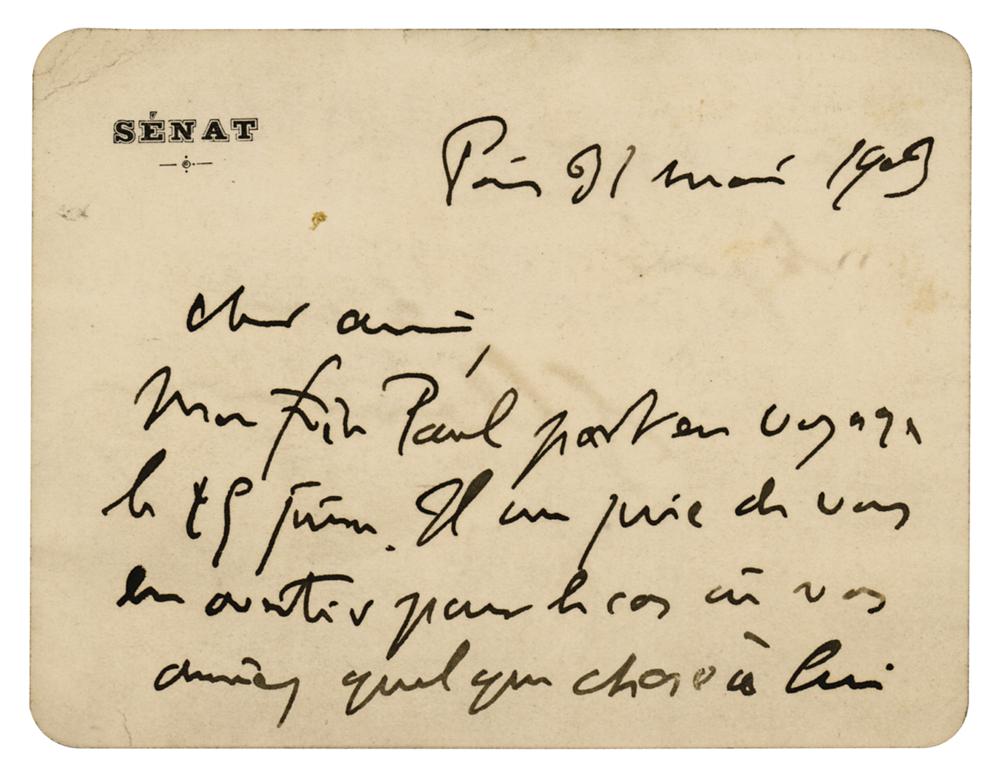 Journalist and statesman (1841-1929) who served as prime minister of France during World War I. ALS in French, signed “G. Clemenceau,” one page both sides, 4.5 x 3.5, Senat letterhead, May 31, 1903. Untranslated handwritten letter to a friend. In fine condition.