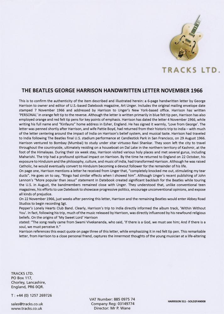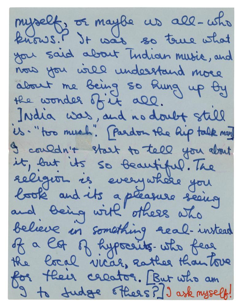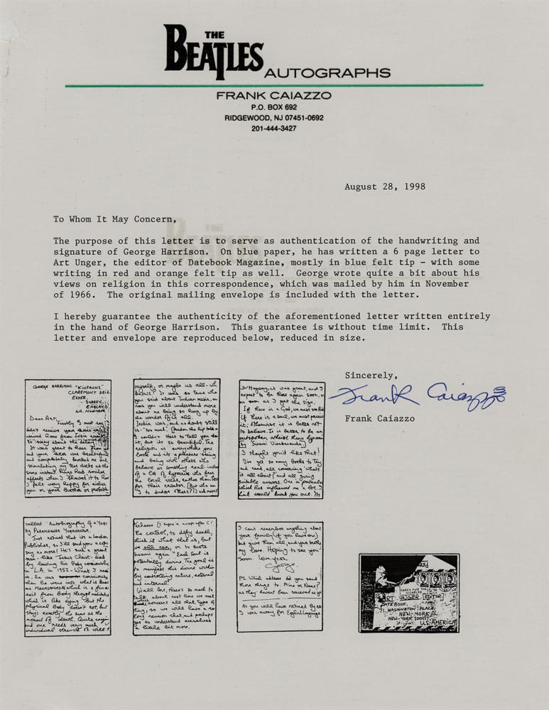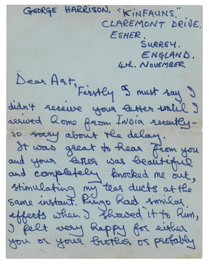 Extraordinary twice-signed ALS signed “Love from, George” and “George Harrison,” six pages, 5.5 x 7, November 4, 1966. Handwritten letter addressed from Harrison’s “Kinfauns” home in Esher, England, sent to his close friend, Art Unger, the owner and editor of the U.S.-based magazine Datebook, shortly after Harrison and his wife, Pattie Boyd, had returned from their historic trip to India. Although the letter is written primarily in blue felt tip, Harrison has also used orange and red felt tip for key points of emphasis, with much of the letter centering around the impact of India on Harrison’s belief system and his musical taste. The letter, in full: “Firstly I must say I didn’t receive your letter until I arrived home from India recently—so sorry about the delay.