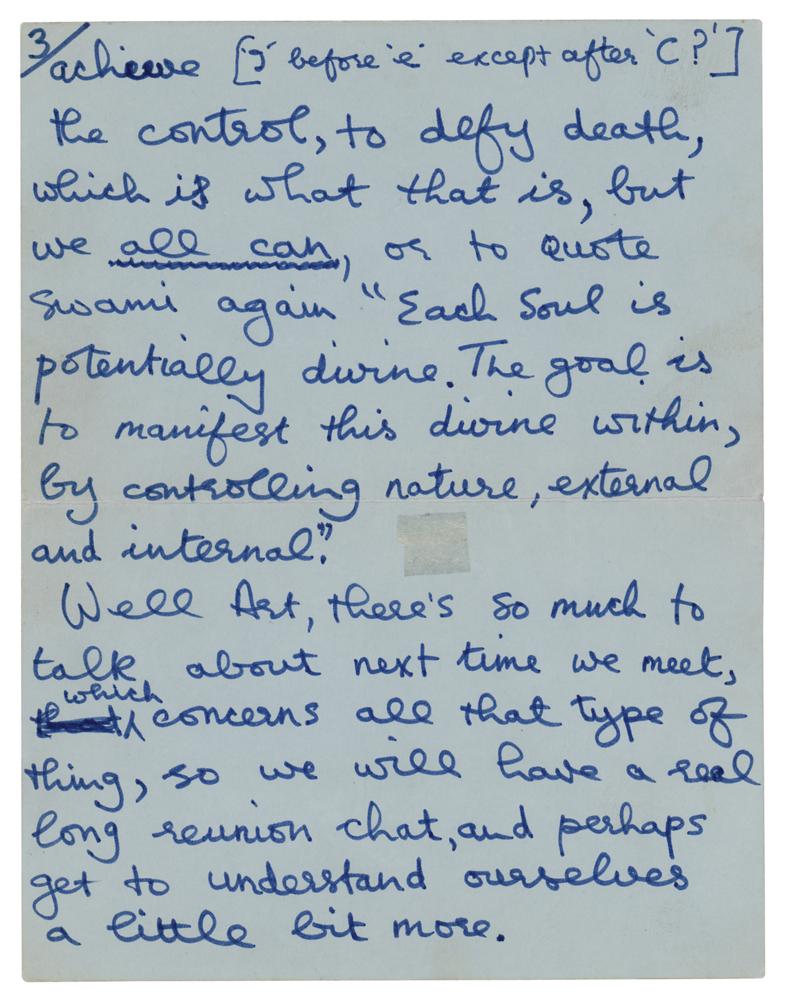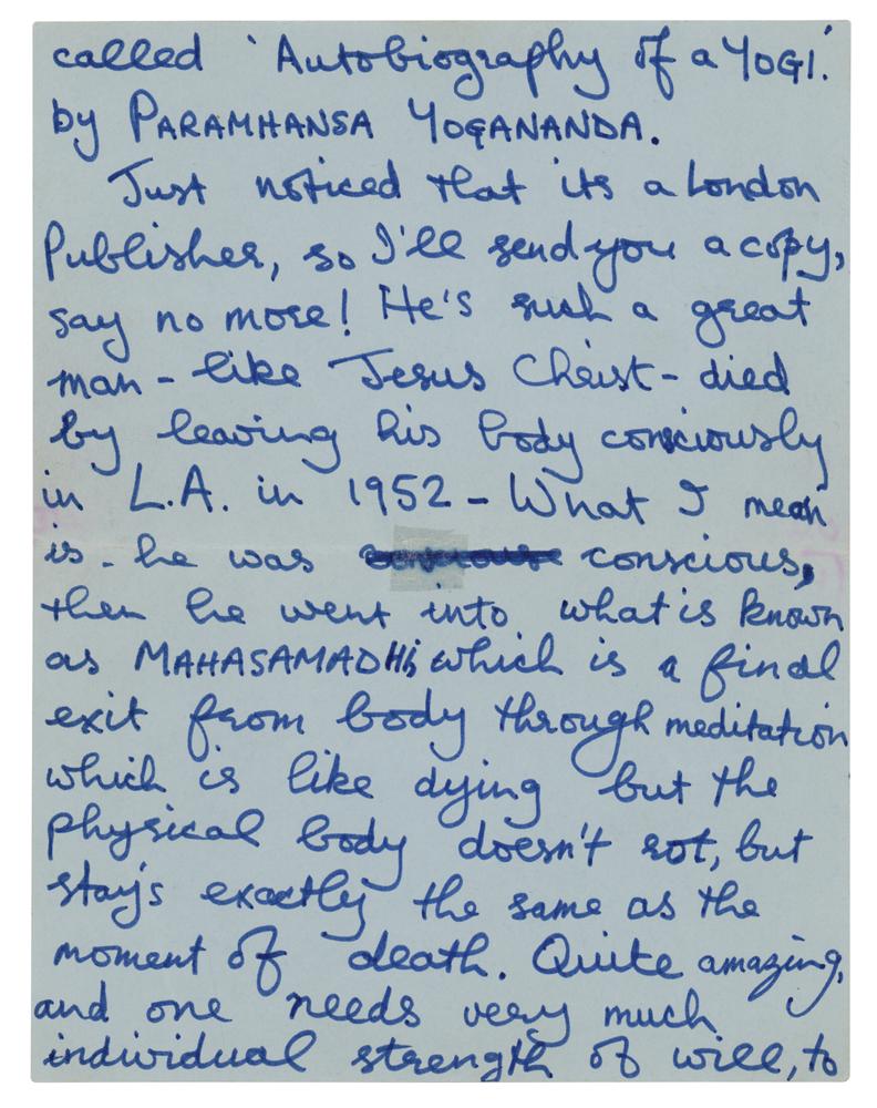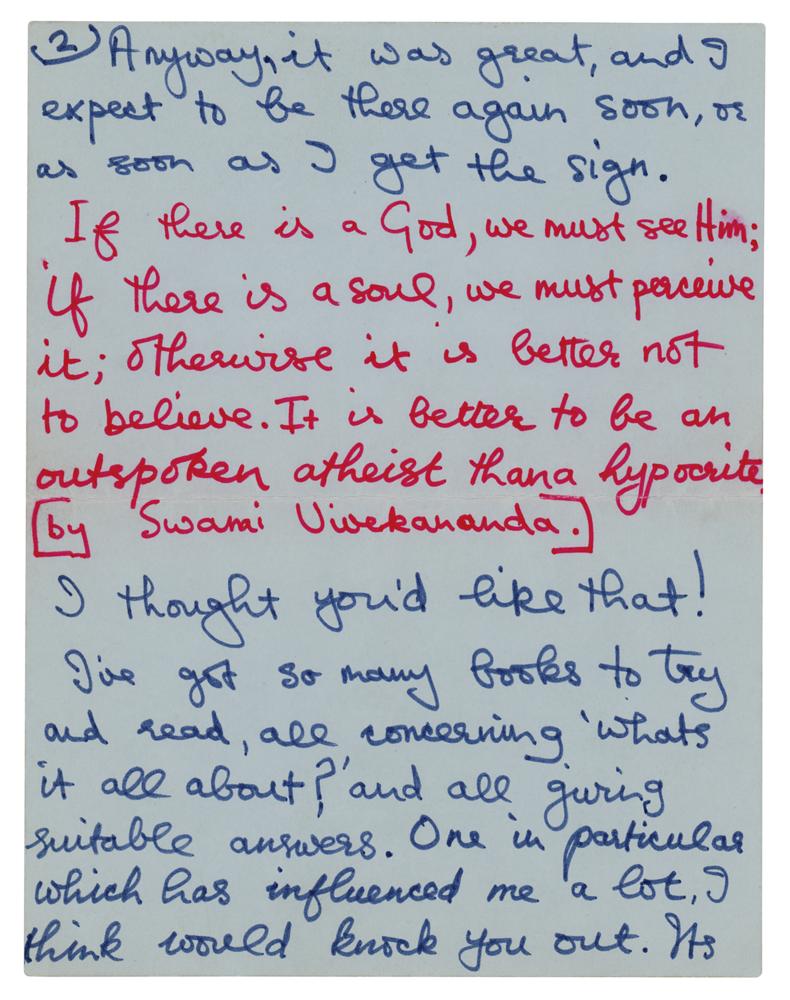On November 22, 1966, just weeks after writing this letter, Harrison and the remaining Beatles entered Abbey Road Studios to begin recording Sgt. Pepper’s Lonely Hearts Club Band. Following Harrison’s trip to India, much of the music he released was influenced by his newfound religious beliefs, in particular the album track ‘Within You Without You,’ his sole composition on Sgt. Pepper. On the origins of ‘My Sweet Lord’ Harrison stated: ‘The song really came from Swami Vivekananda, who said, ‘If there is a God, we must see him; And if there is a soul, we must perceive it.’ Harrison references this exact quote on page three of this letter while emphasizing it in red felt tip. This remarkable letter, from Harrison to a close personal friend, captures the innermost thoughts of the young musician at a life-altering stage. Handwritten material by any member of the Beatles, particularly during the Sgt. Pepper-era, is exceedingly rare and desirable—an extraordinary letter from the late Beatles guitarist.