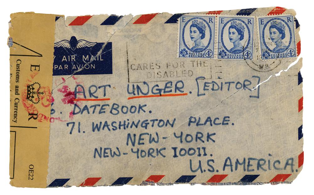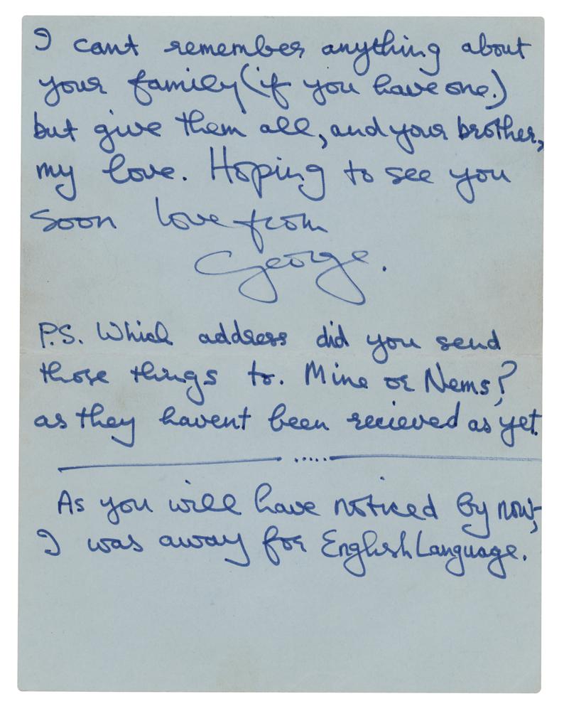 Well Art, there’s so much to talk about next time we meet, which concerns all that type of thing, so we will have a real long reunion chat, and perhaps get to understand ourselves a little bit more. I can’t remember anything about your family (if you have one), but give them all, and your brother, my love. Hoping to see you soon.” Harrison adds a postscript: “P.S. Which address did you send those things to. Mine or Nems? As they haven’t been received yet? As you will have noticed by now, I was away for English Language.” The second autograph is incorporated in the address Harrison has added to the top of the first page. In fine condition, with a small tape stain to each page. Accompanied by the original mailing envelope addressed by Harrison, who adds “Personal” on the reverse flap, and by letters of authenticity from Tracks and noted Beatles expert Frank Caiazzo.