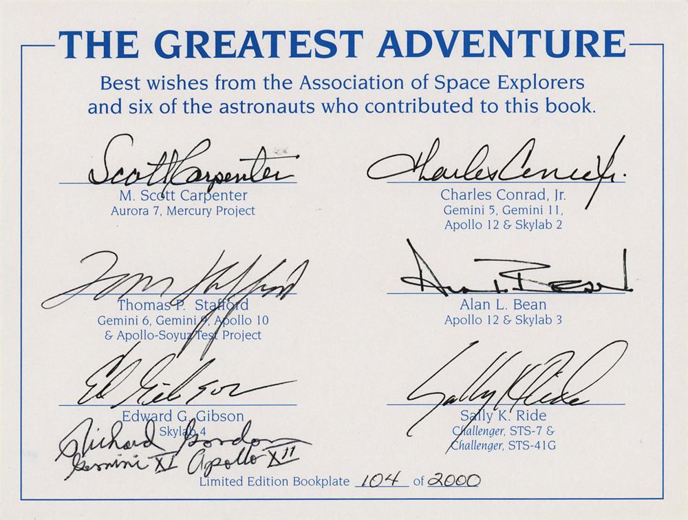 Unused limited edition 7.25 x 5.5 bookplate for the 1994 book The Greatest Adventure, numbered 104/2000, signed in black ink by seven astronauts—Scott Carpenter, Charles Conrad, Tom Stafford, Alan Bean, Ed Gibson, Sally Ride, and Richard Gordon. In fine condition.