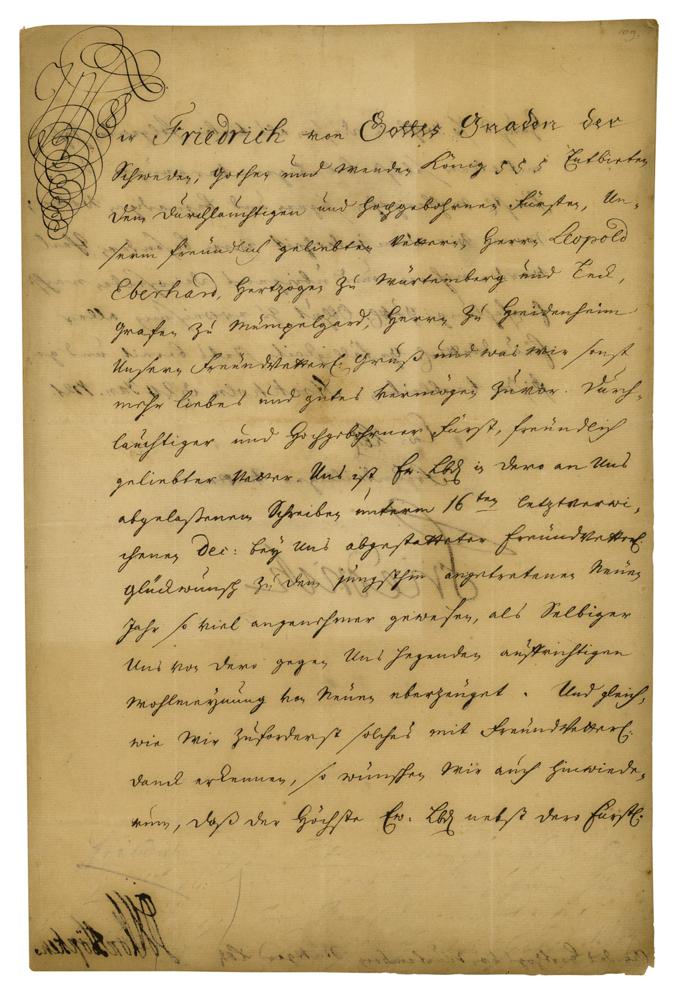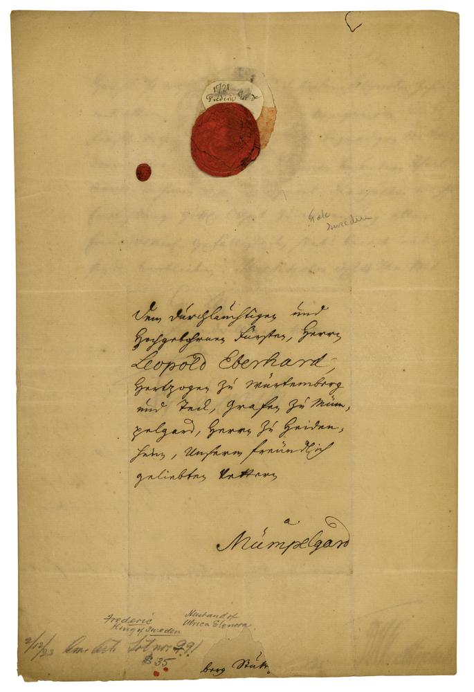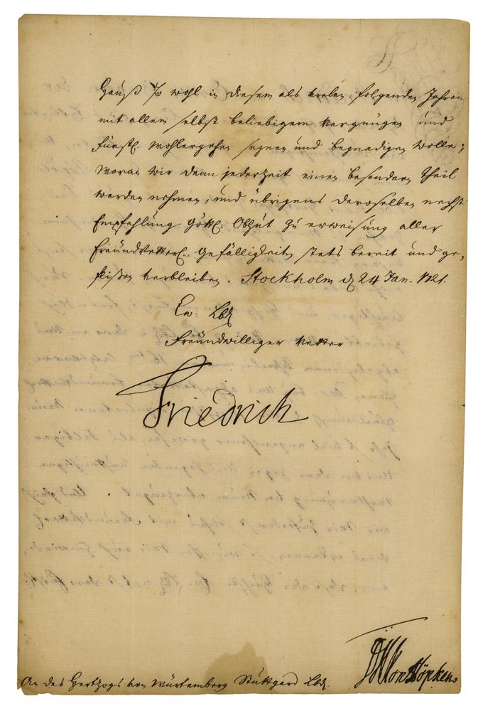 Manuscript DS in Swedish, signed “Friedrich,” one page both sides, 8.5 x 13, January 24, 1721. Untranslated document prominently signed at the conclusion by Frederick I as King of Sweden. The red wax seal remains affixed to reverse. In very good to fine condition, with some scattered staining and chipping to edges.